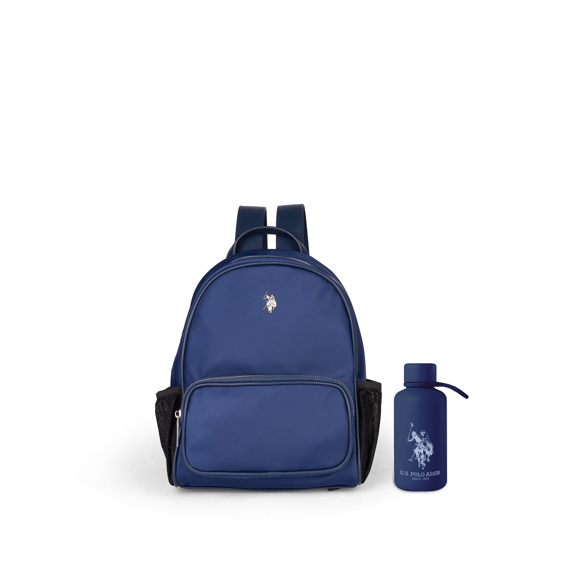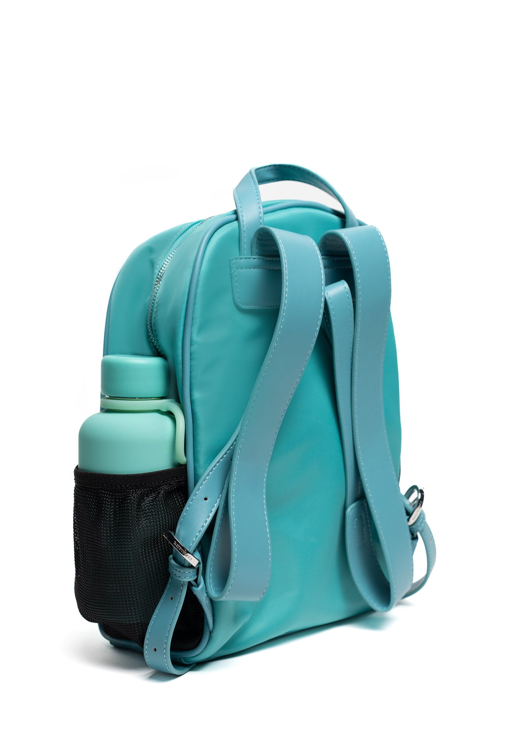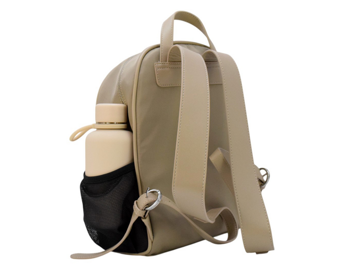 Rounded zip-top day backpack with front zip pocket and elasticated mesh pockets on both sides sized for the bottle or other accessories. Padded adjustable straps. Includes a 350 ml stainless-steel + silicone water bottle.