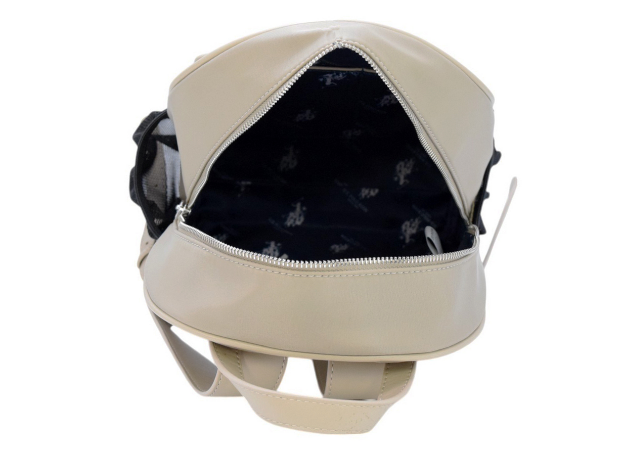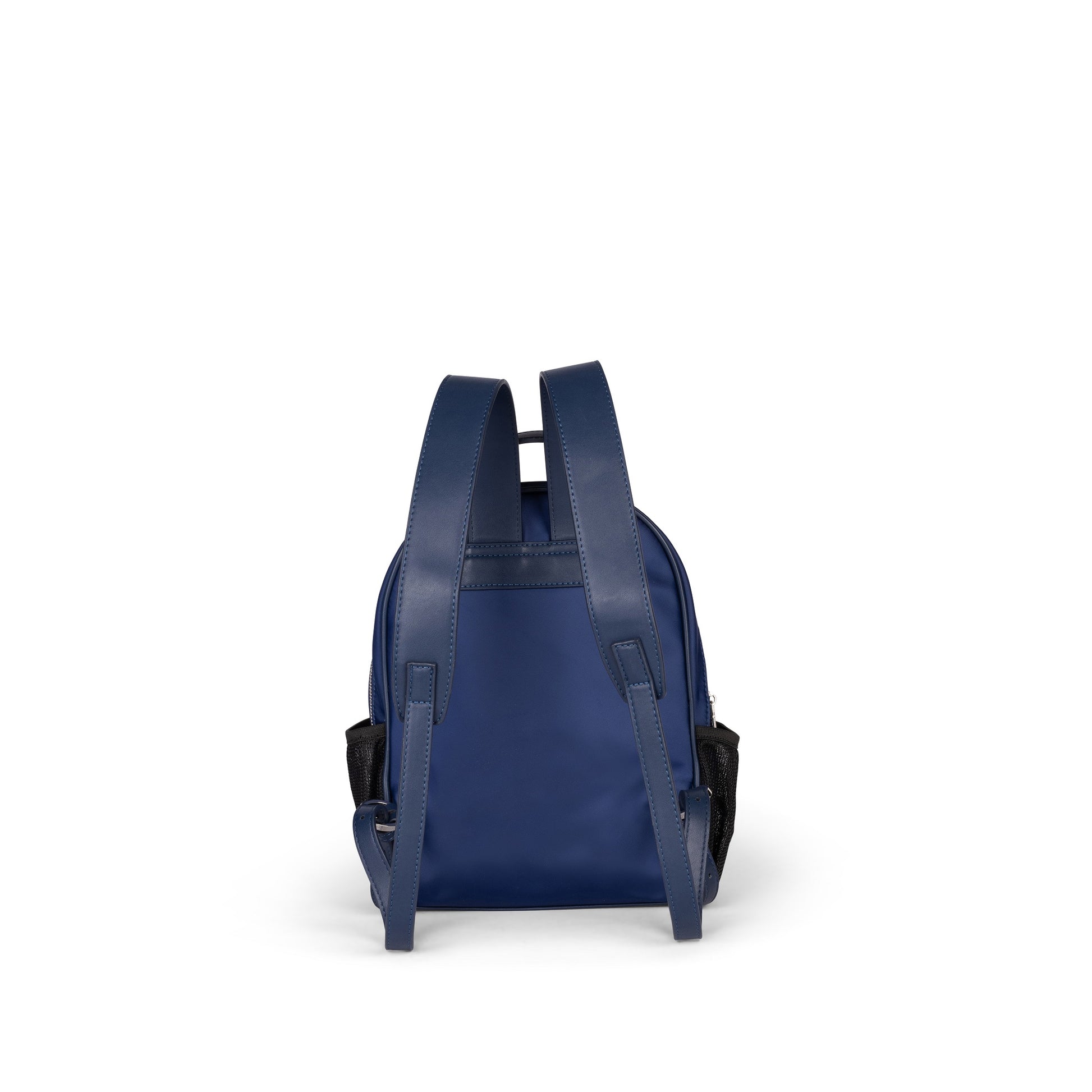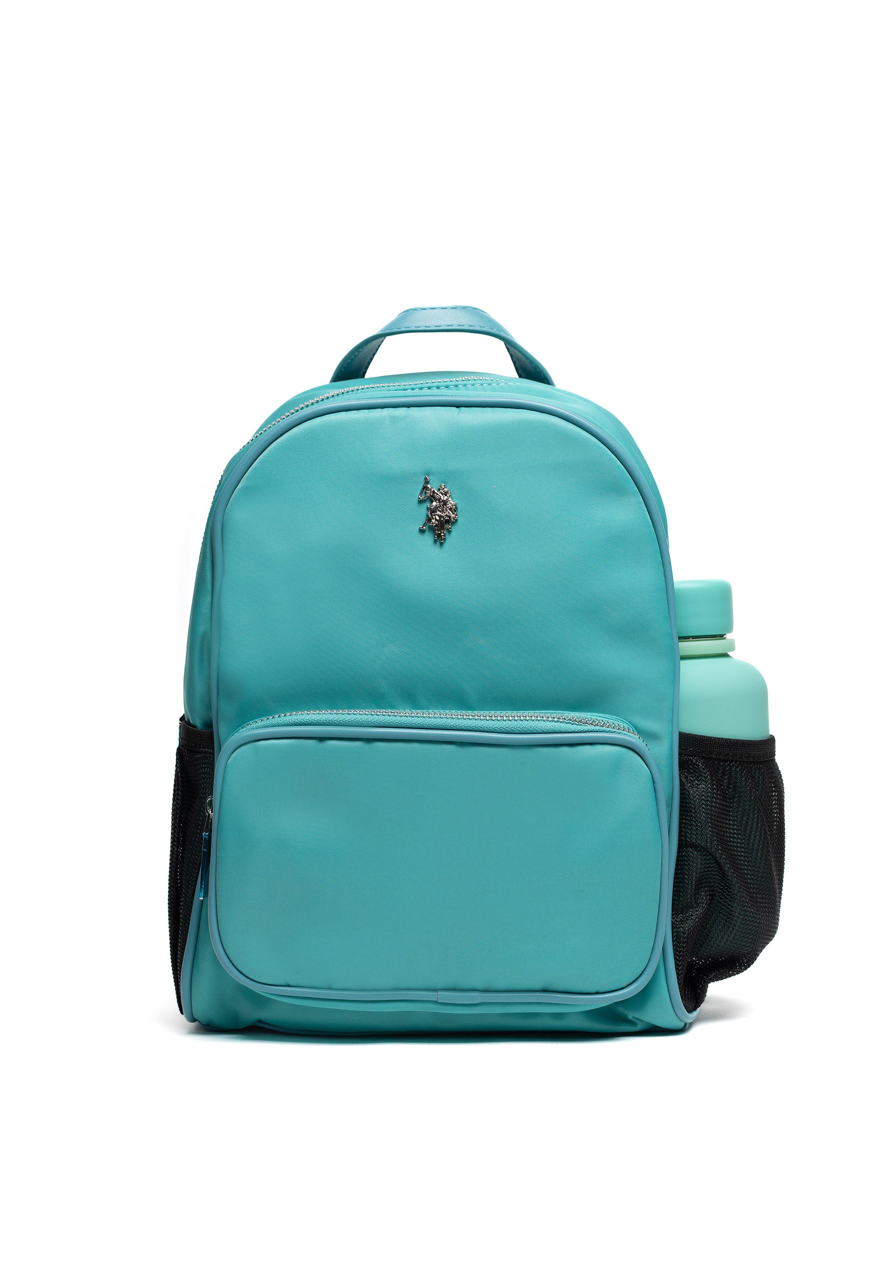 Rounded zip-top day backpack with front zip pocket and elasticated mesh pockets on both sides sized for the bottle or other accessories. Padded adjustable straps. Includes a 350 ml stainless-steel + silicone water bottle.