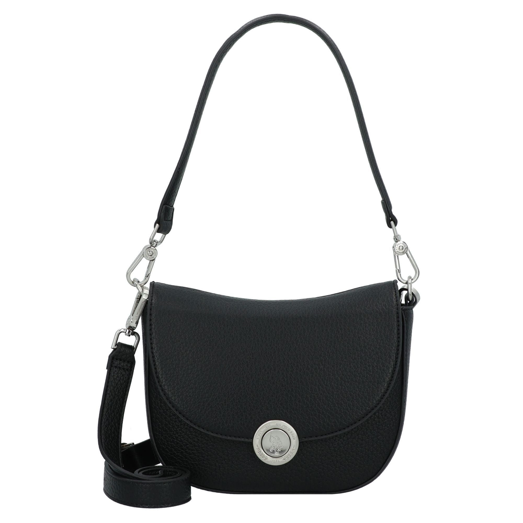 Flap-shoulder silhouettes offered in plain PU and seasonal print. Signature round logo fastener at front. Two straps supplied: a short shoulder handle and a long adjustable crossbody.