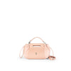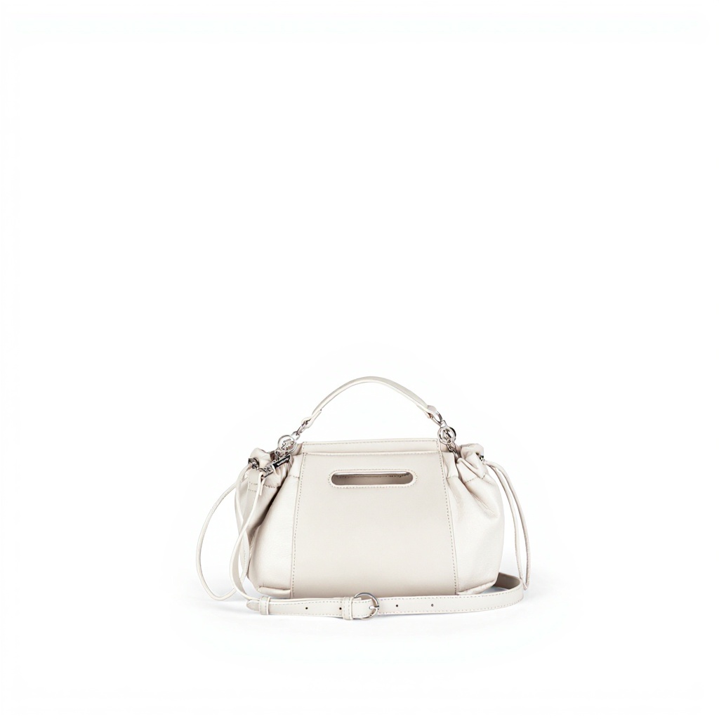 A small satchel with a modern slot-handle cutout and gathered sides, main zip closure compartment. Includes a detachable, adjustable long strap in addition to the short top handle with chain connector.
