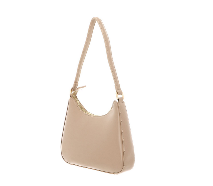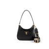 A compact half-moon hobo with a curved top line and zip entry. Carried by a single shoulder handle, it looks refined and lightweight on the model. A detachable, adjustable long strap in logo jacquard webbing is shown for crossbody styling, attaching at polished side rings.