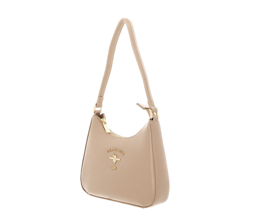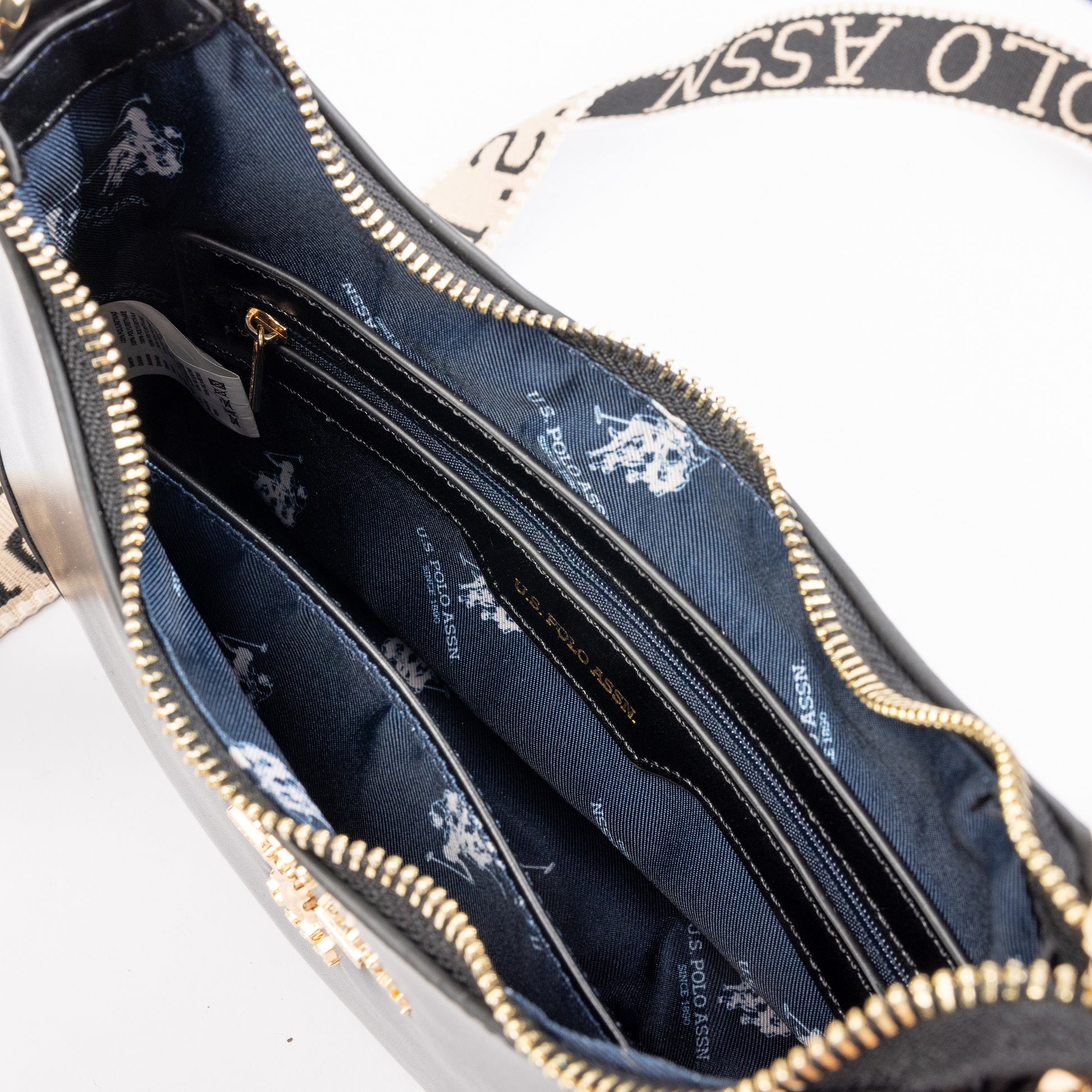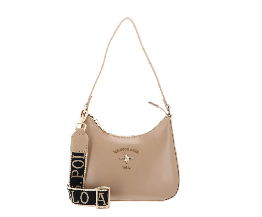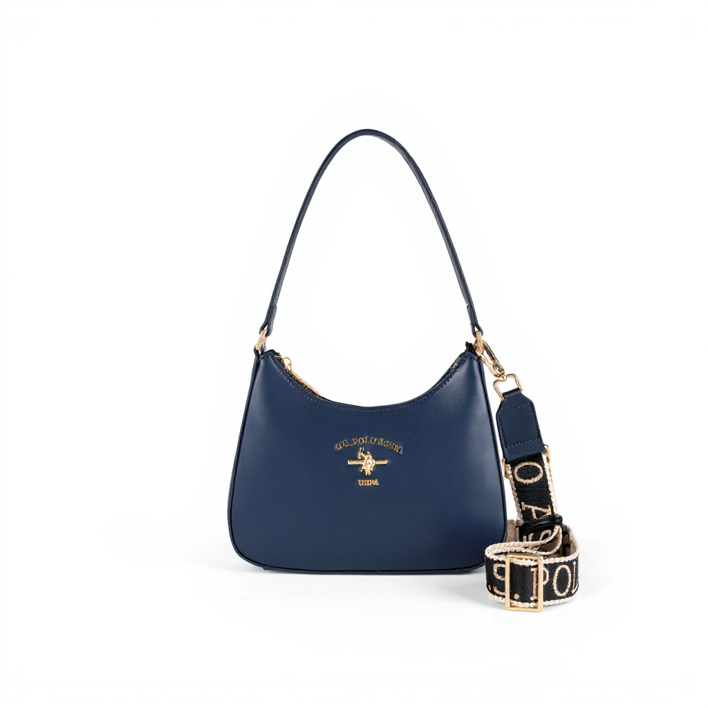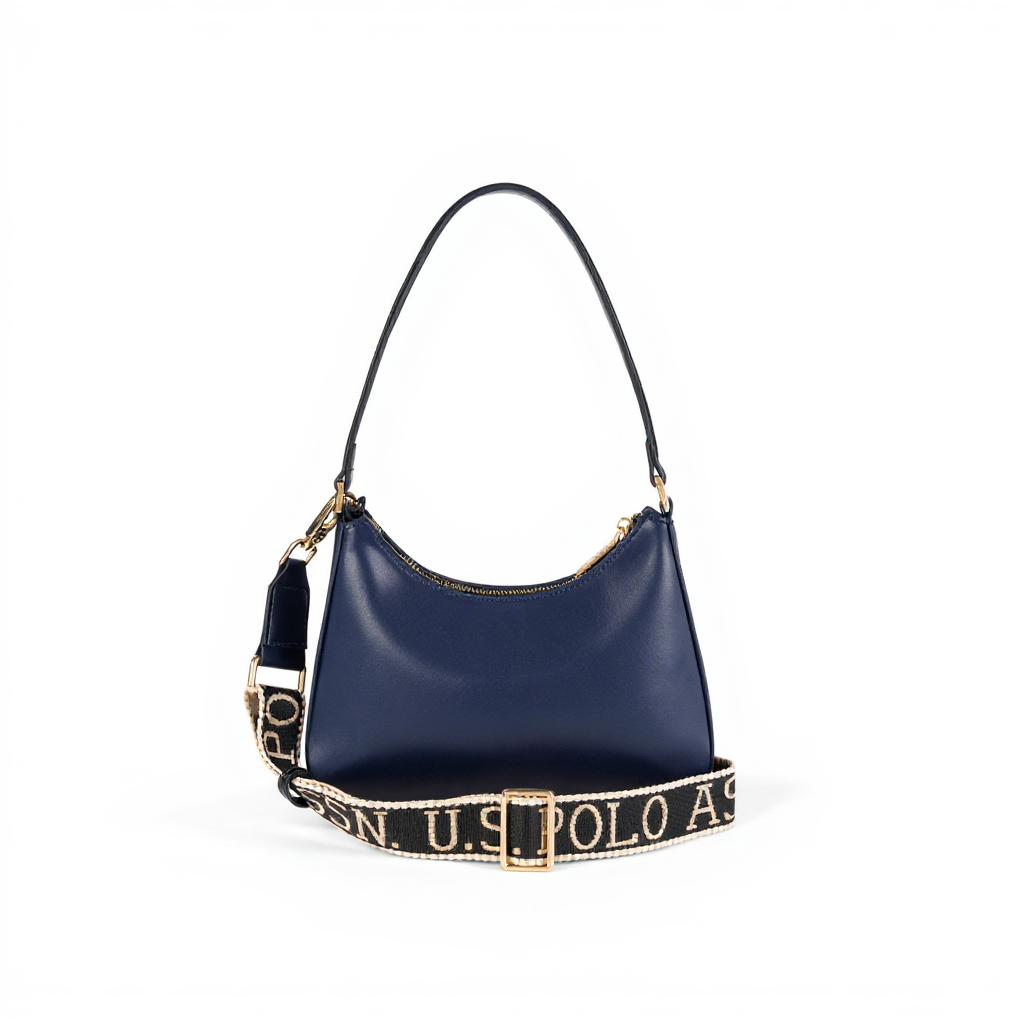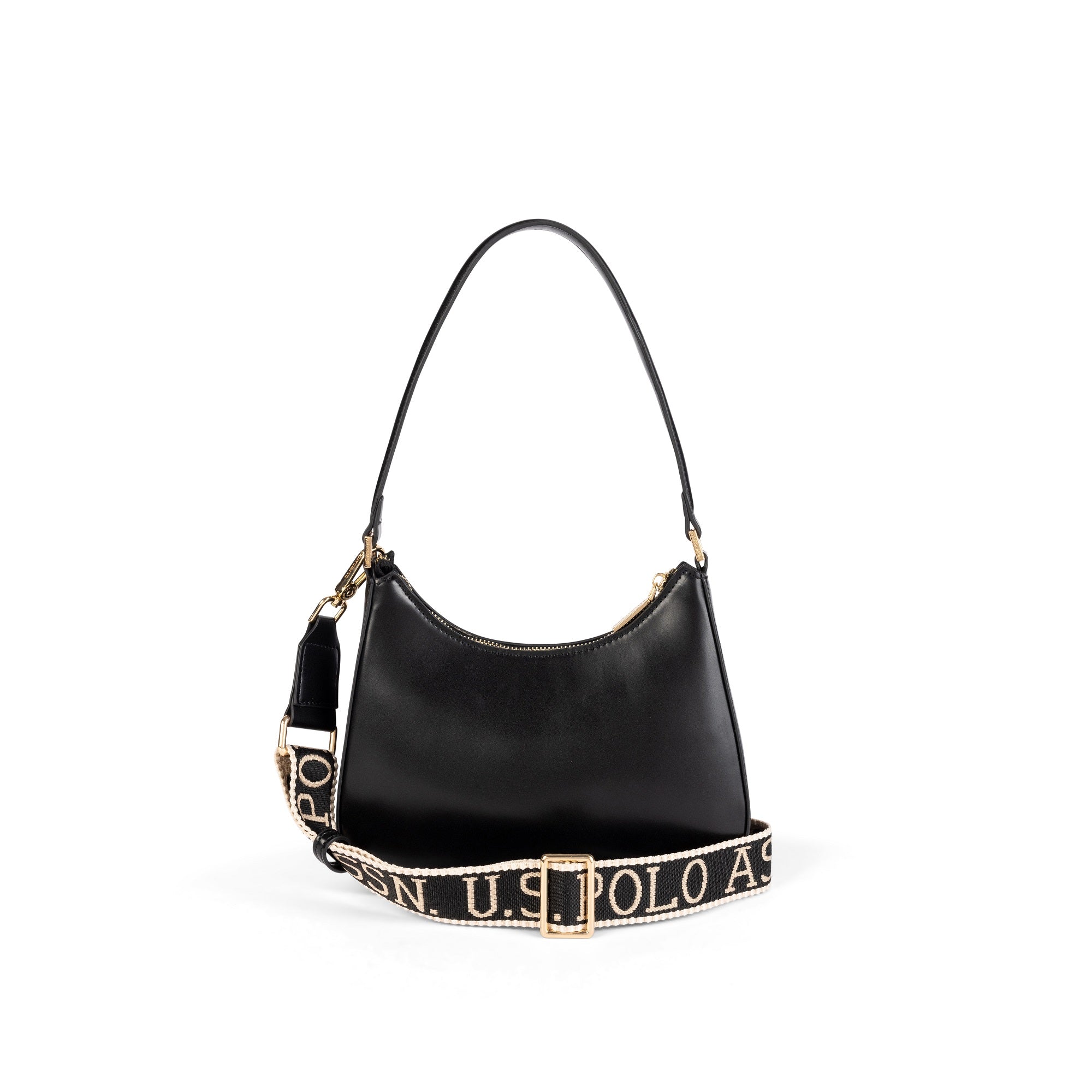 jacquard shoulder strap. Smooth-effect PU with a subtle sheen and branded metal logo.