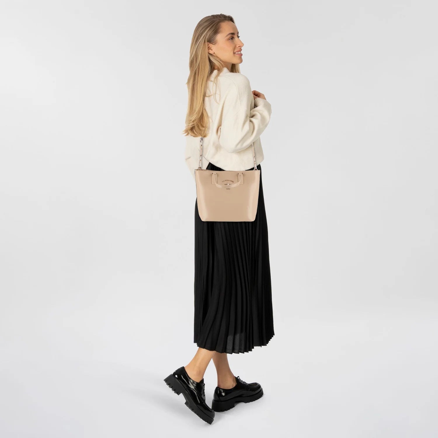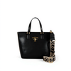 A scaled-down shopping silhouette with crisp edges and a secure top-zip. Carried by twin handles, it sits close to the body with a polished look. A detachable logo jacquard long strap is included and shown, converting the bag into an easy crossbody.