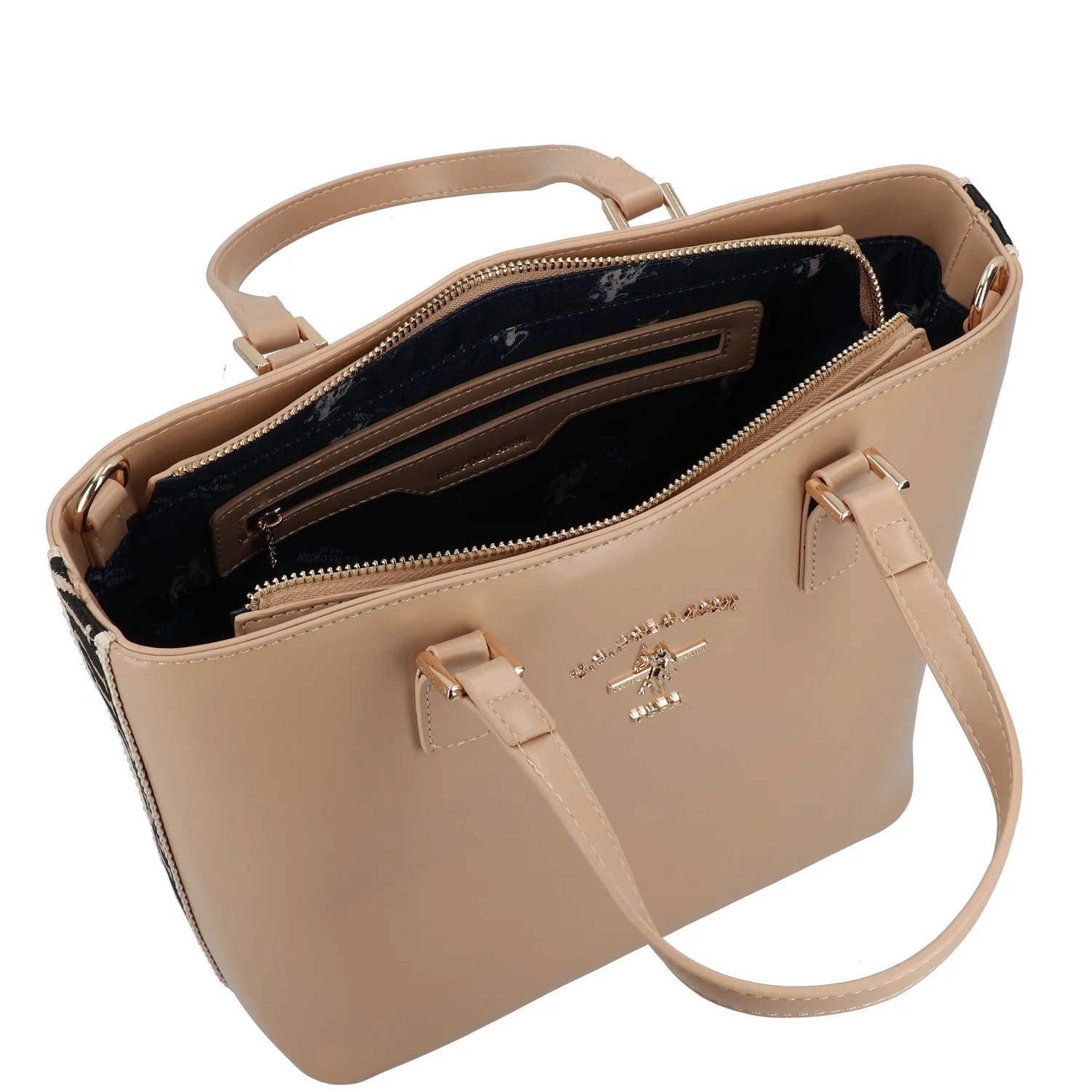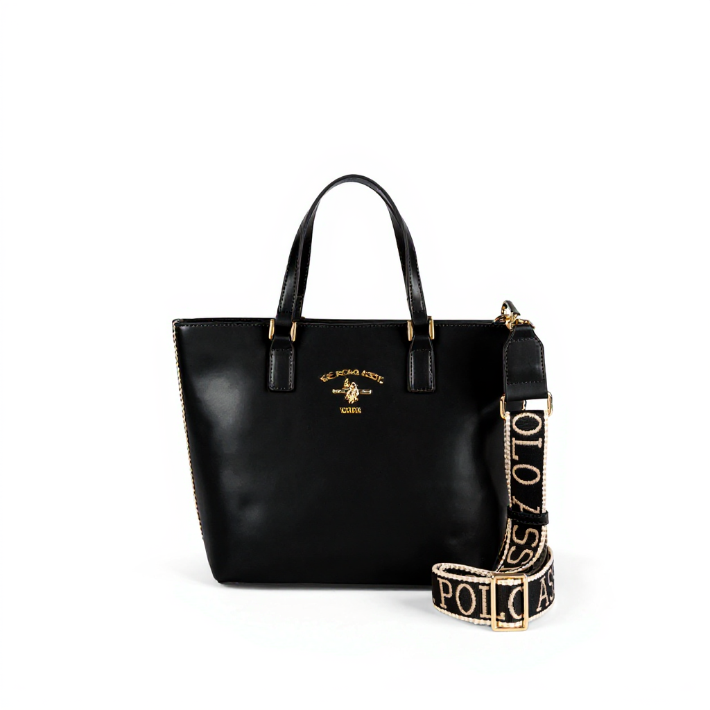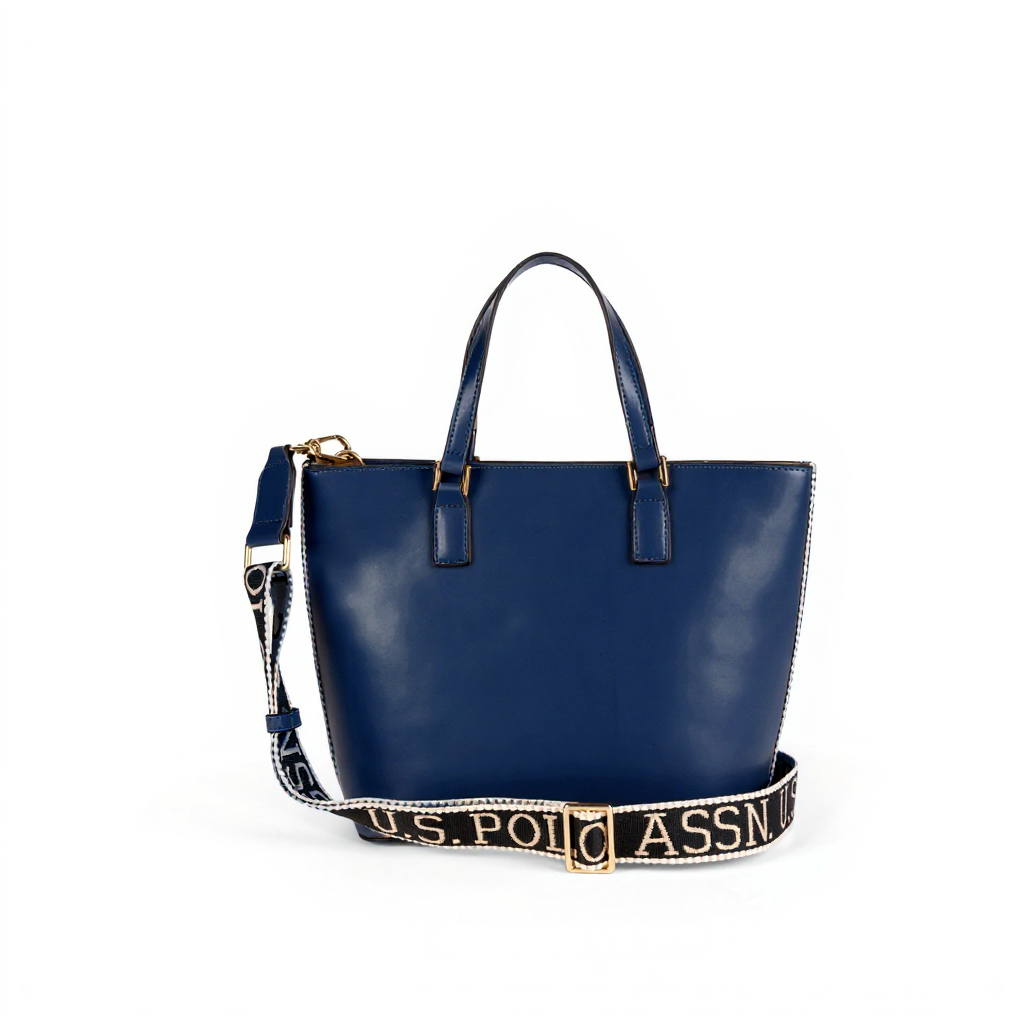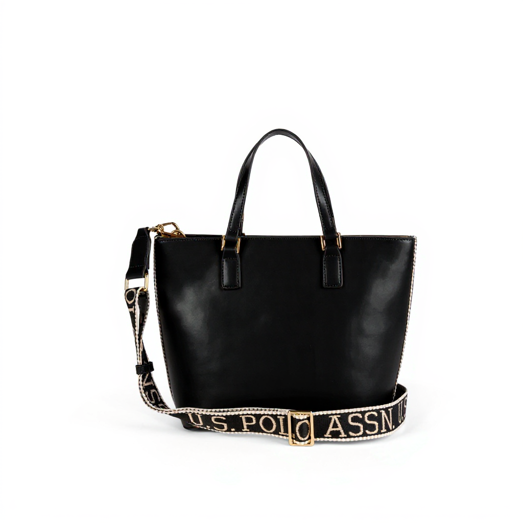jacquard shoulder strap. Smooth-effect PU with a subtle sheen and branded metal logo.