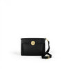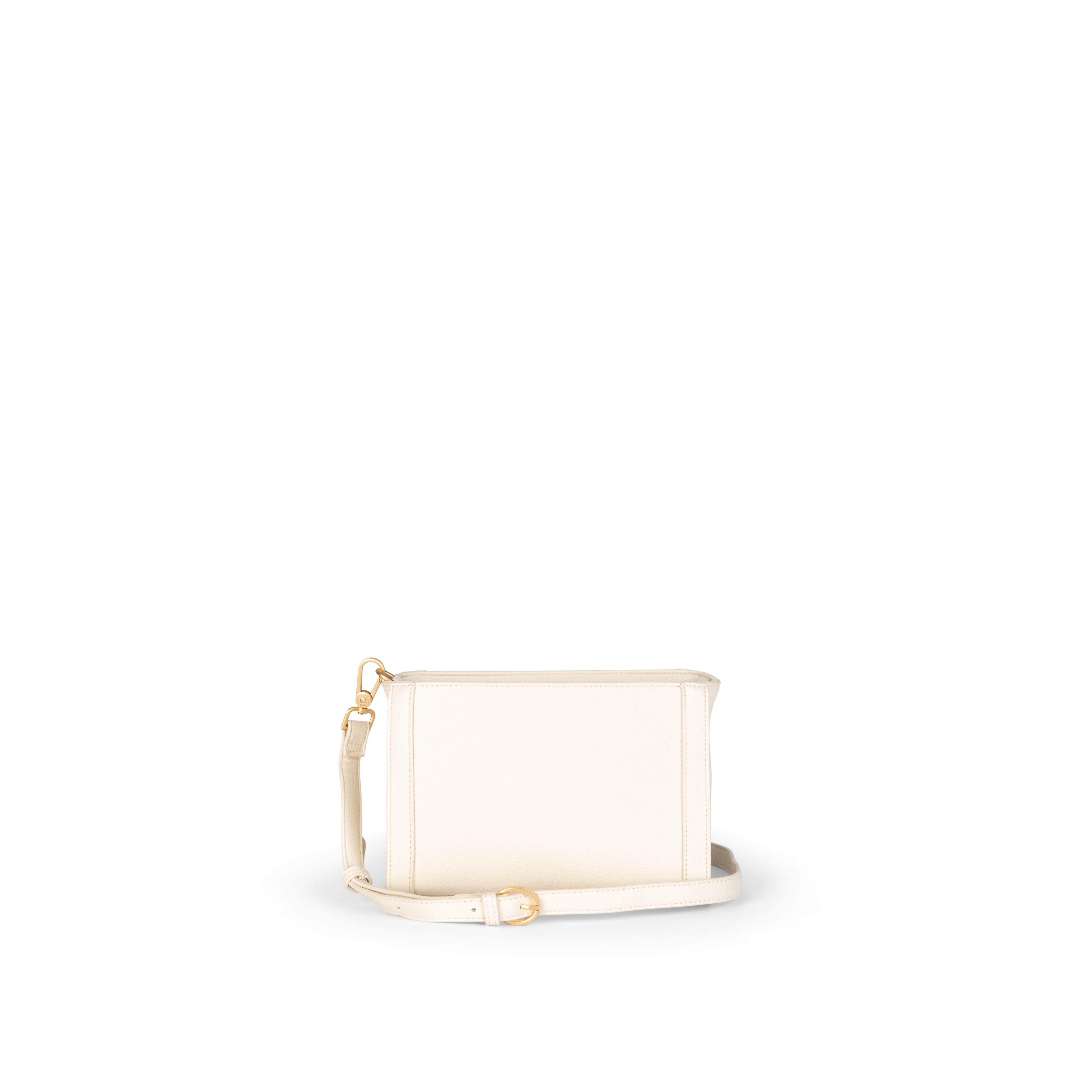 Slim crossbody with top zip and the collection front pocket featuring saddle stitching and the round logo fastener. Internal central zip divider for further organization. Detachable, adjustable long strap with buckle for exact drop length.