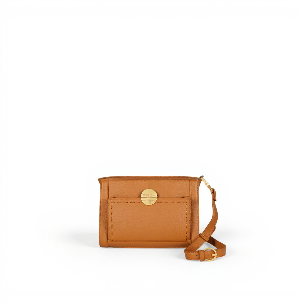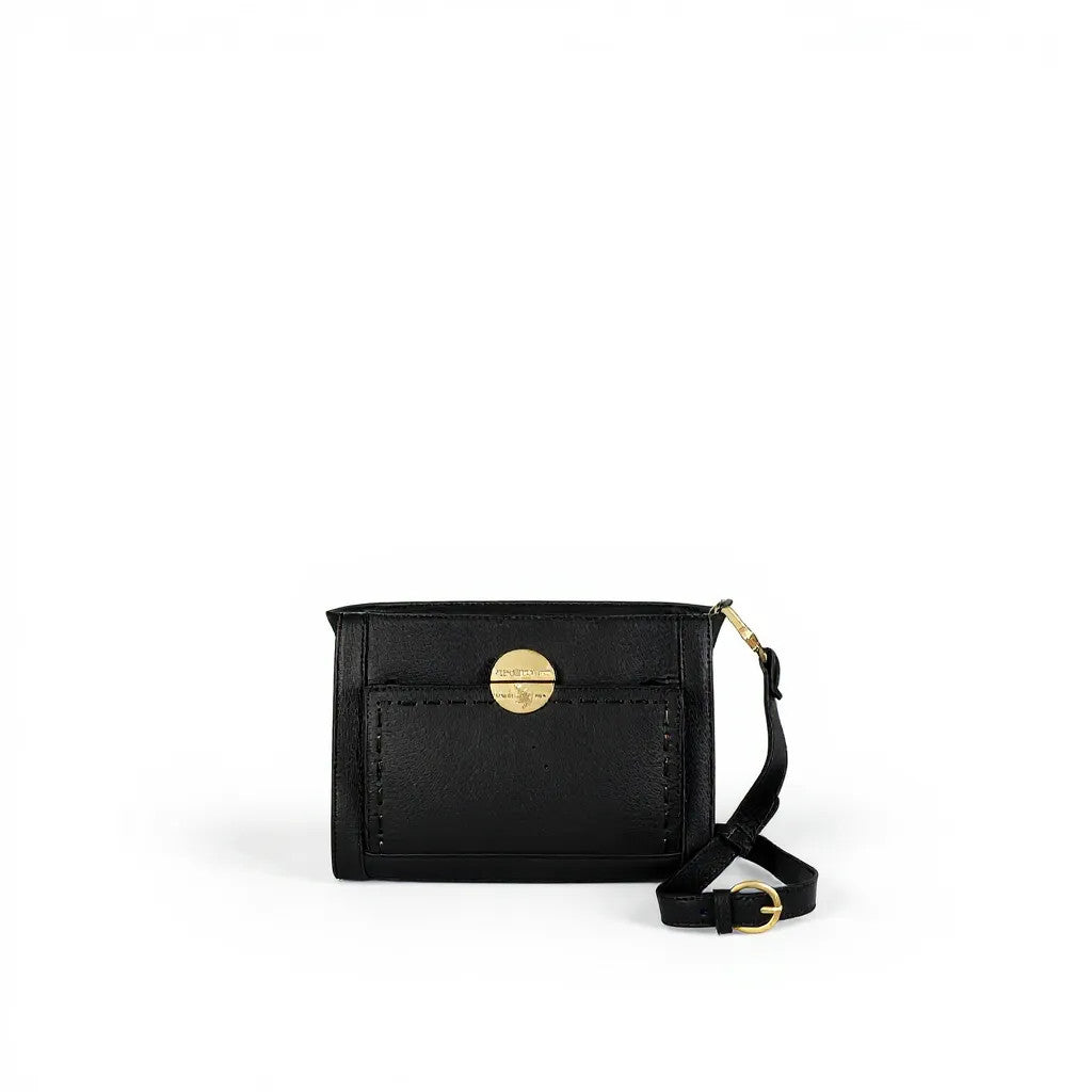 Practical bags with a front pocket and saddlery-inspired details like hand-look stitching. The pocket closes with a round logoed metal fastener.