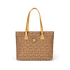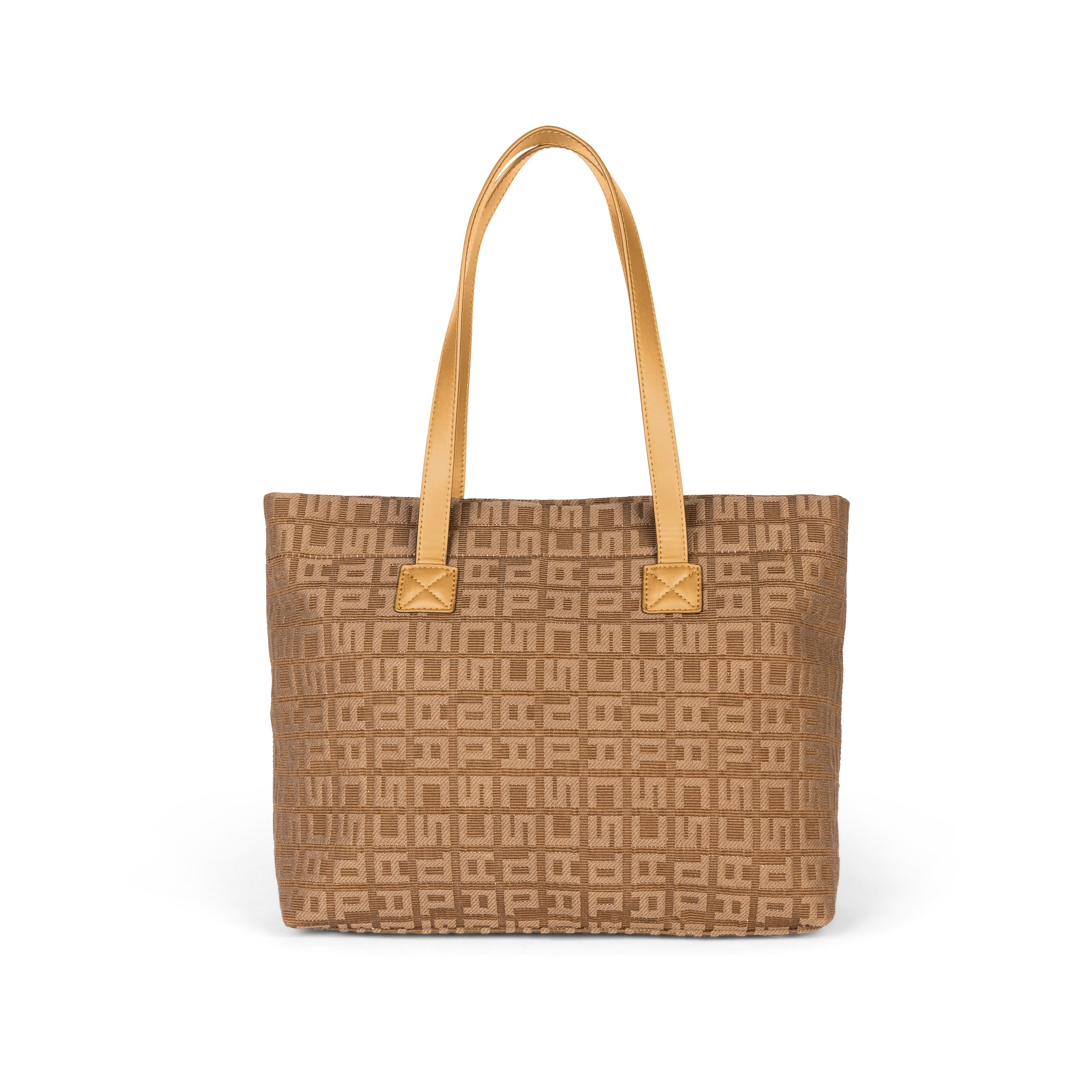 Structured shopper with slim shoulder handles and tidy top tab. All-over jacquard pattern and signature round logo medallion at front; roomy interior for daily carry.