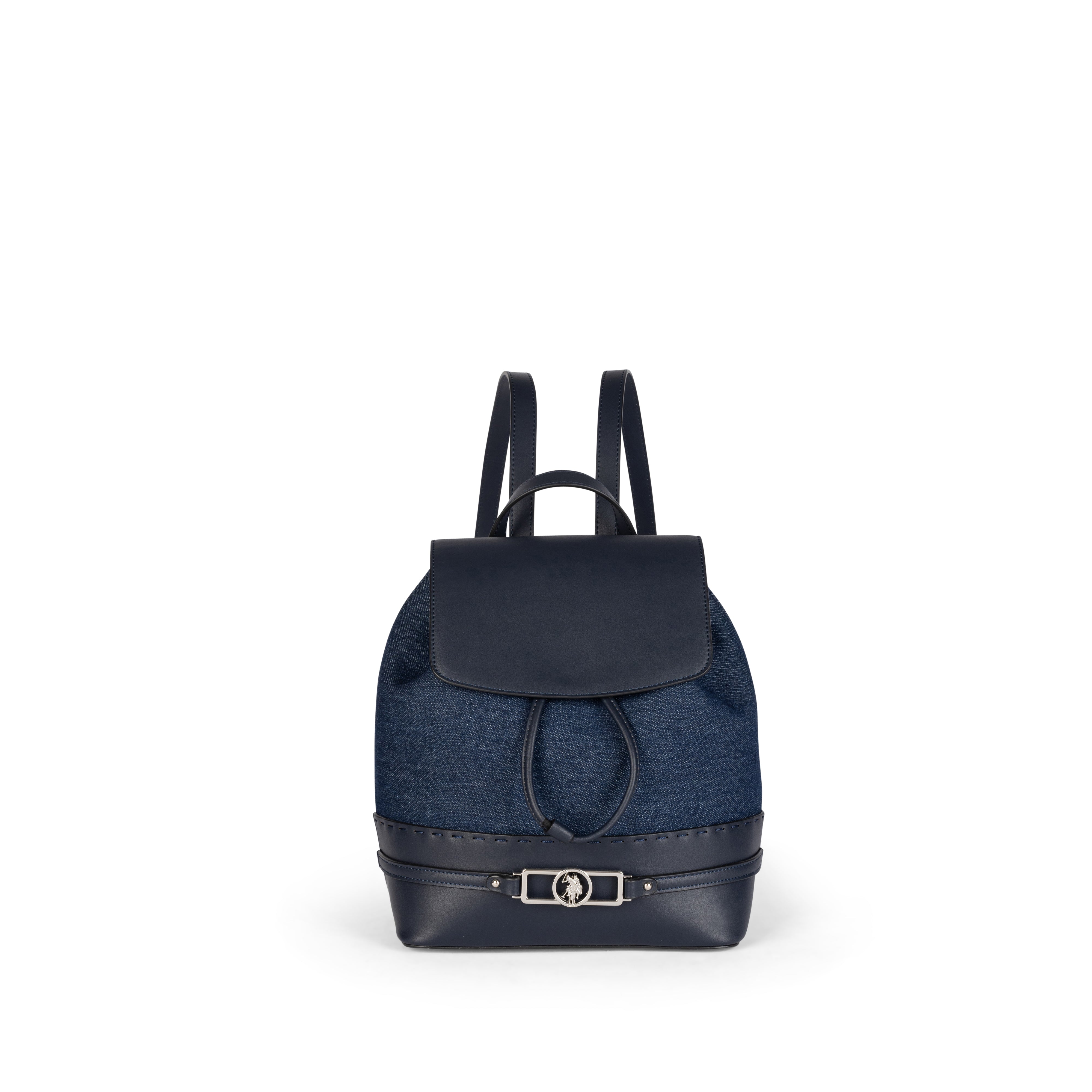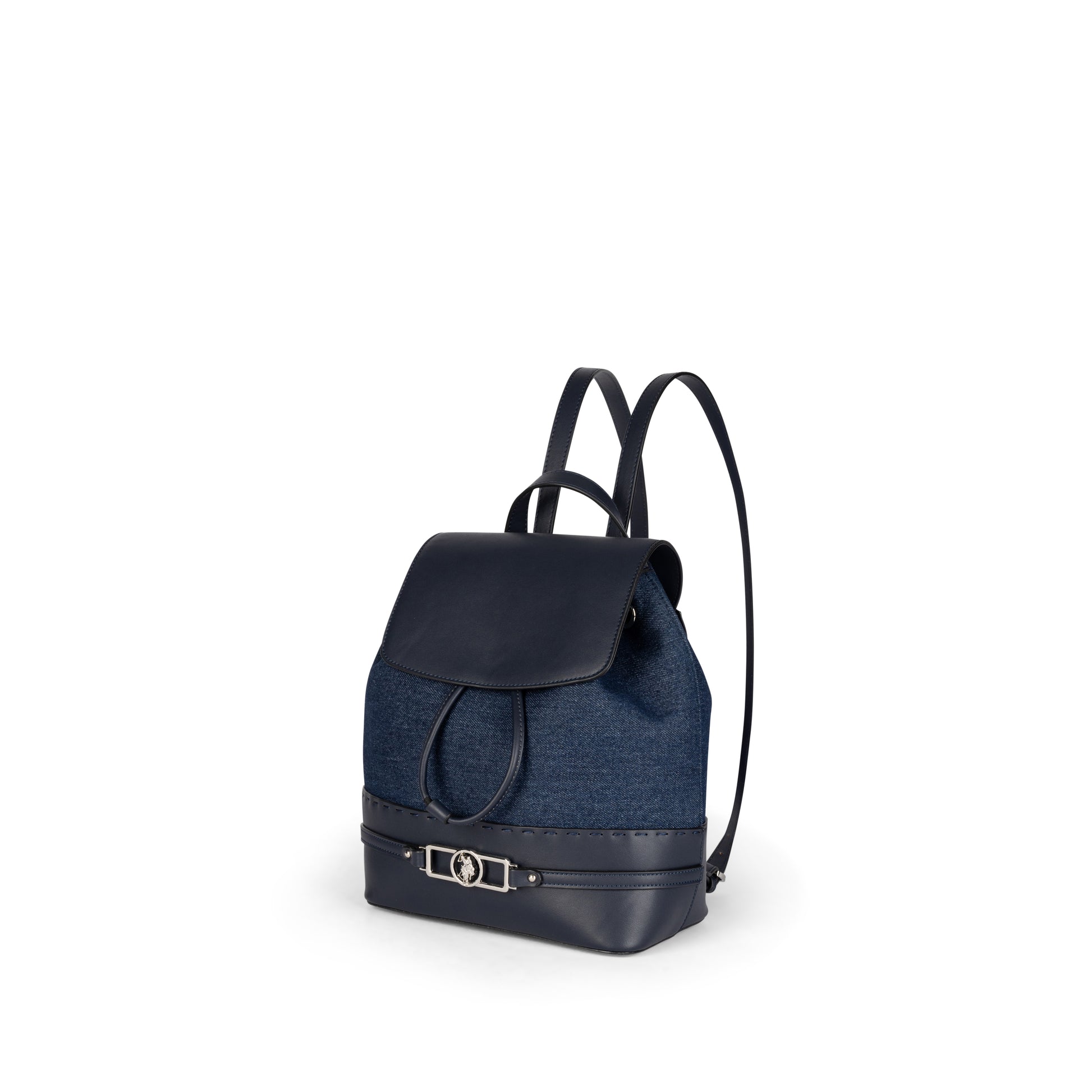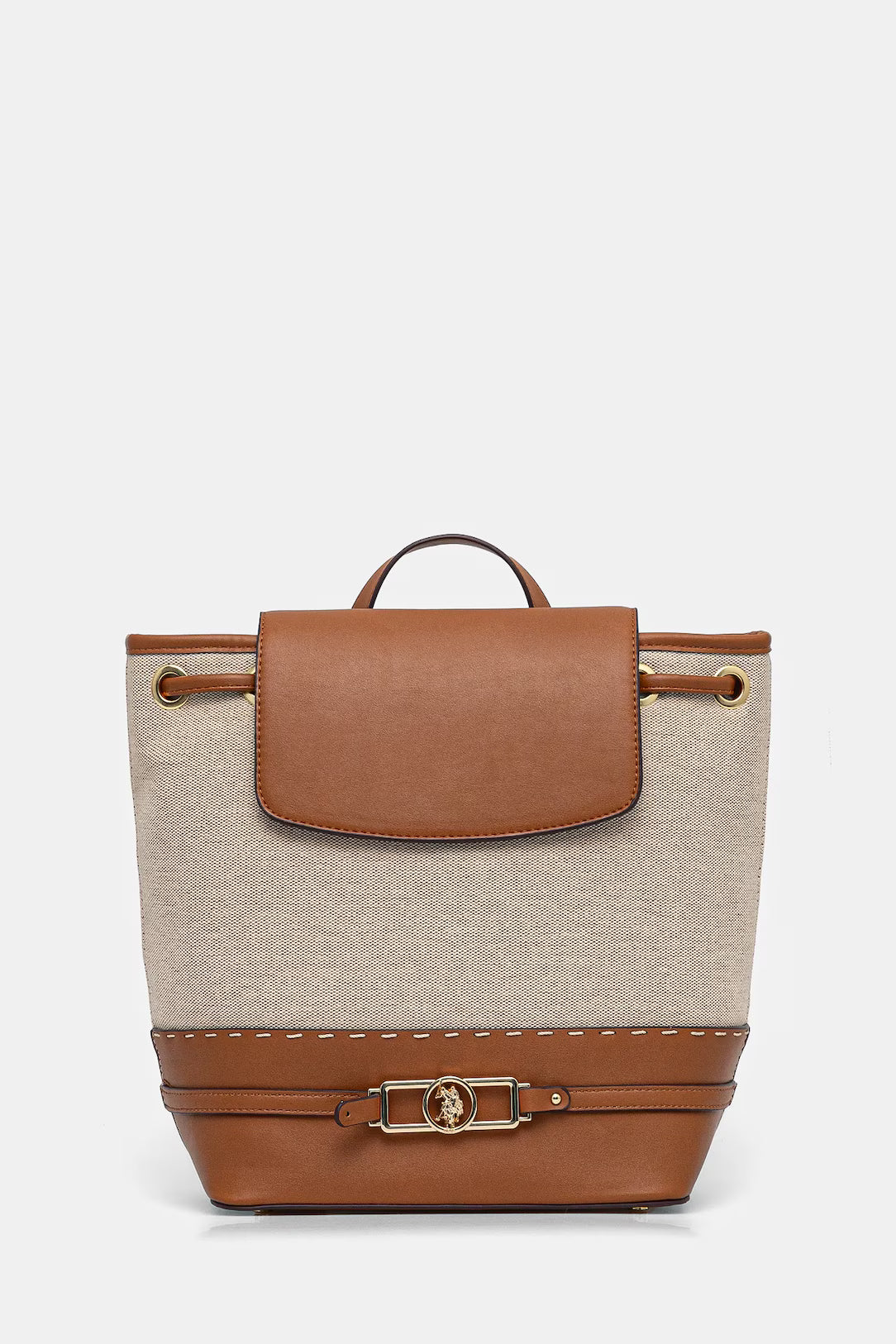 Small day backpack with flap-and-drawstring closure and adjustable shoulder straps. PU-trimmed base band with equestrian plaque; lightweight and easy to wear.