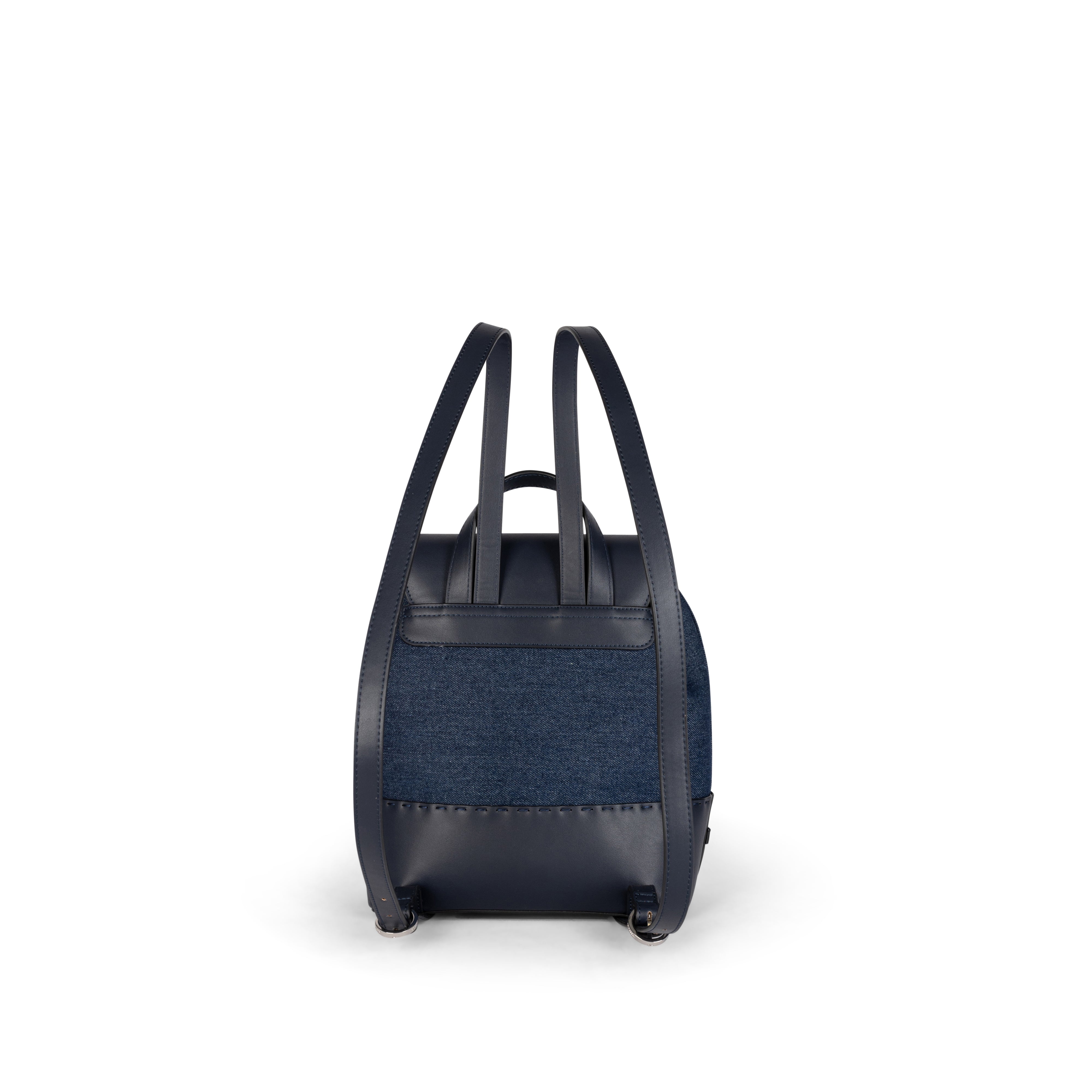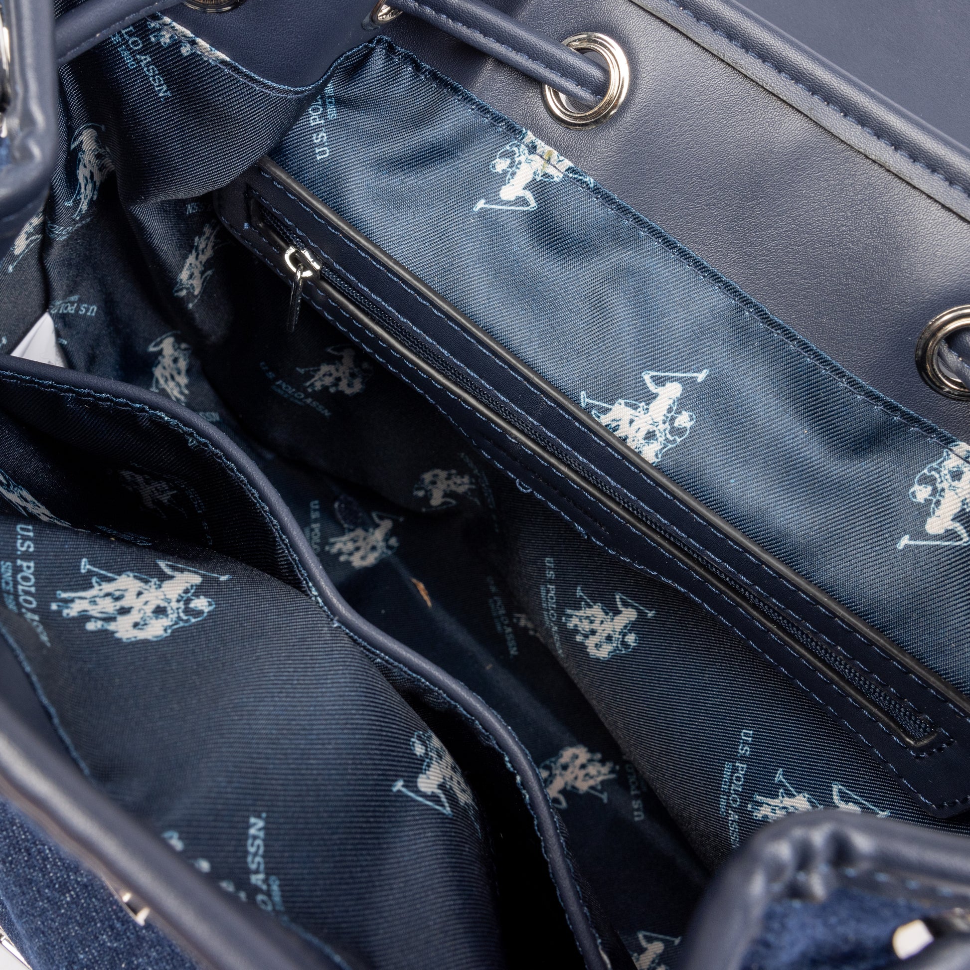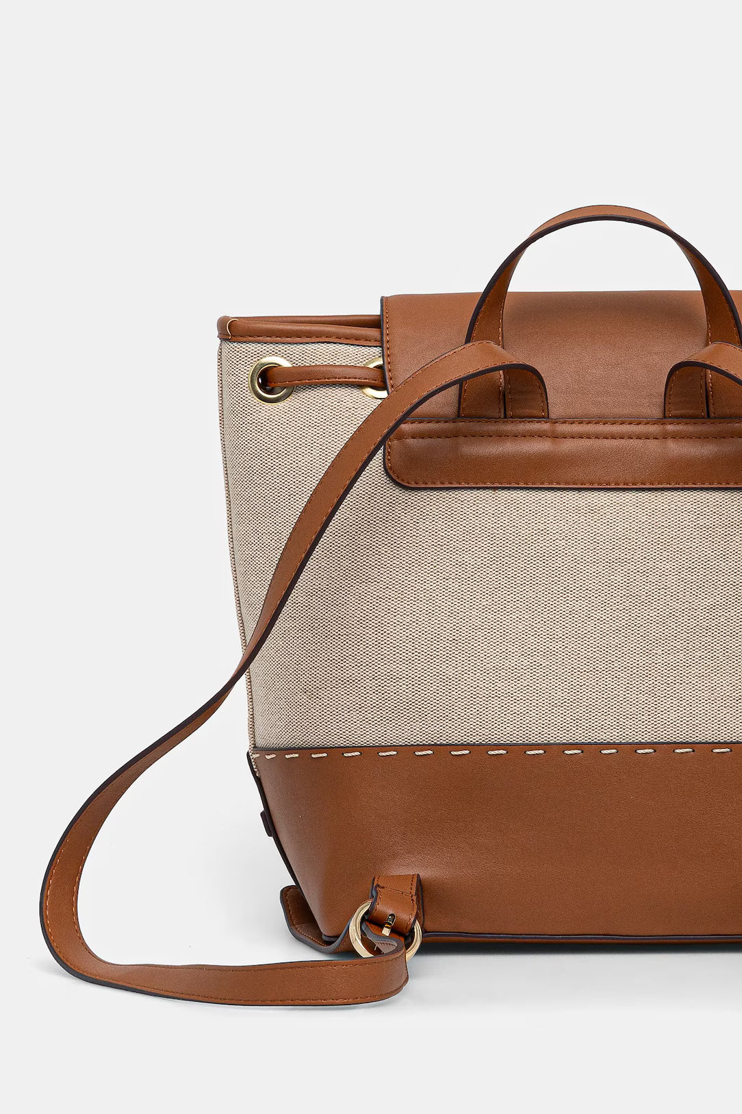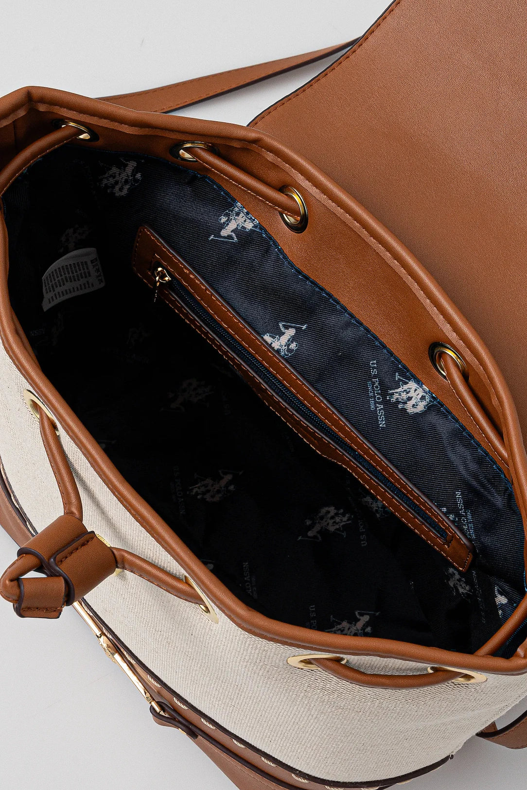 Small day backpack with flap-and-drawstring closure and adjustable shoulder straps. PU-trimmed base band with equestrian plaque; lightweight and easy to wear.