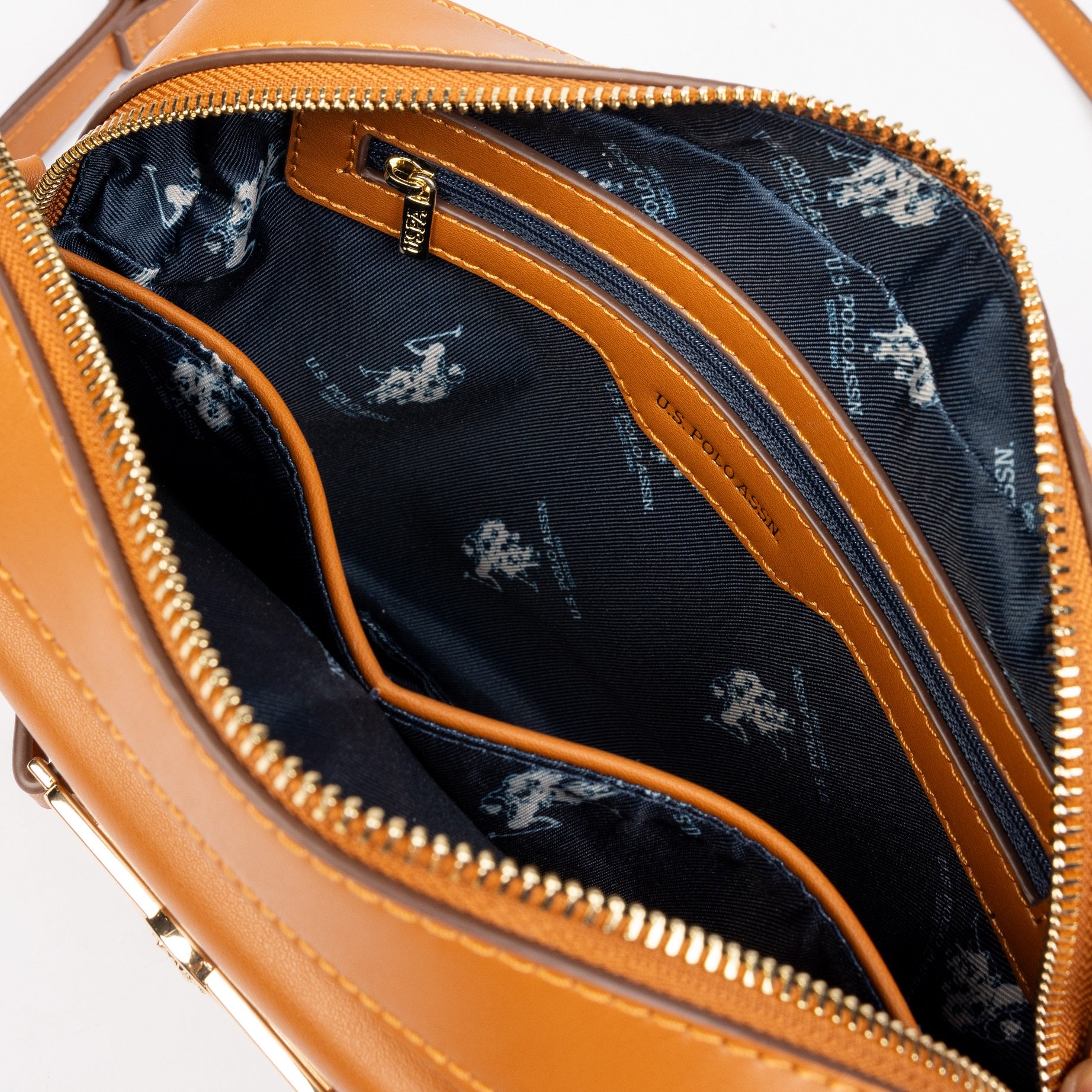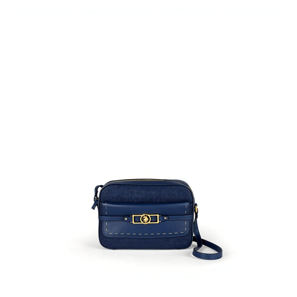 Compact camera-style crossbody with zip top and long adjustable strap. Front stitched belt panel frames the circular USPA medallion for a polished finish.