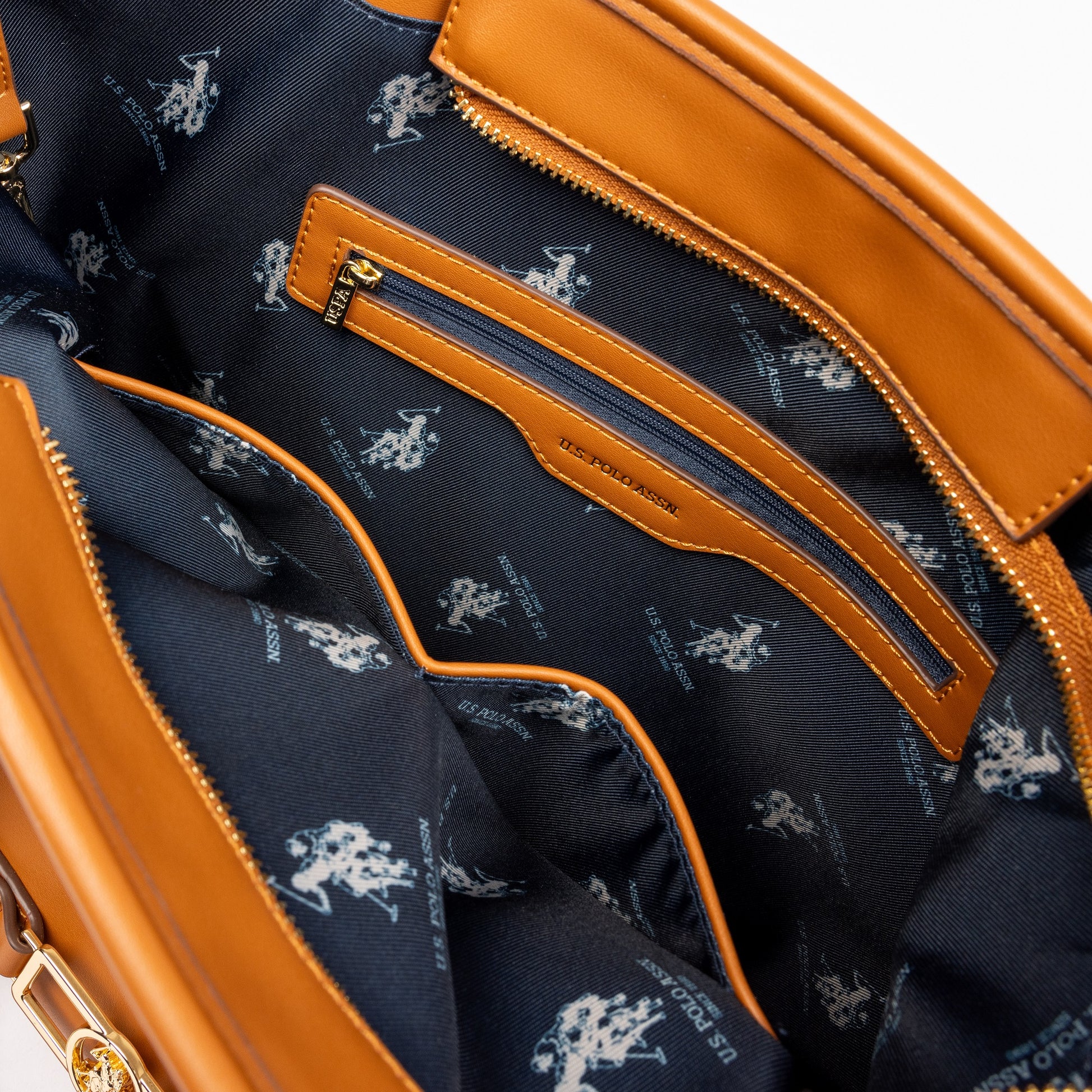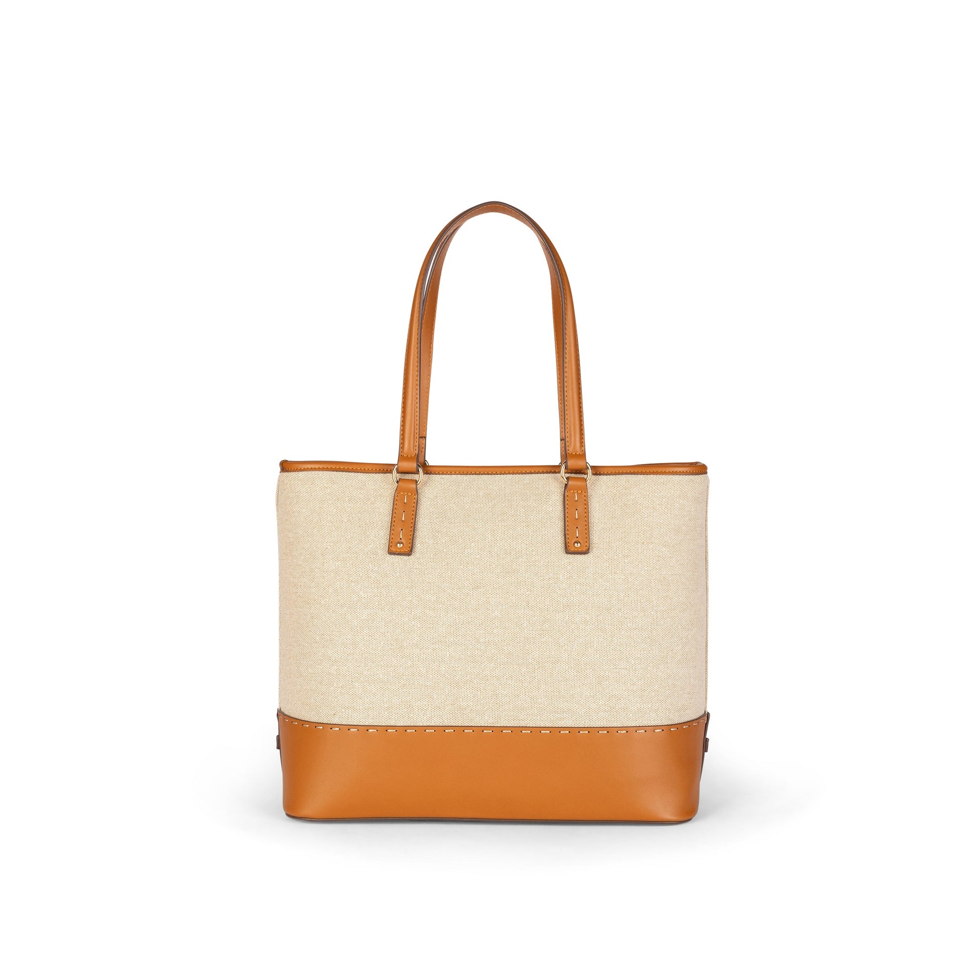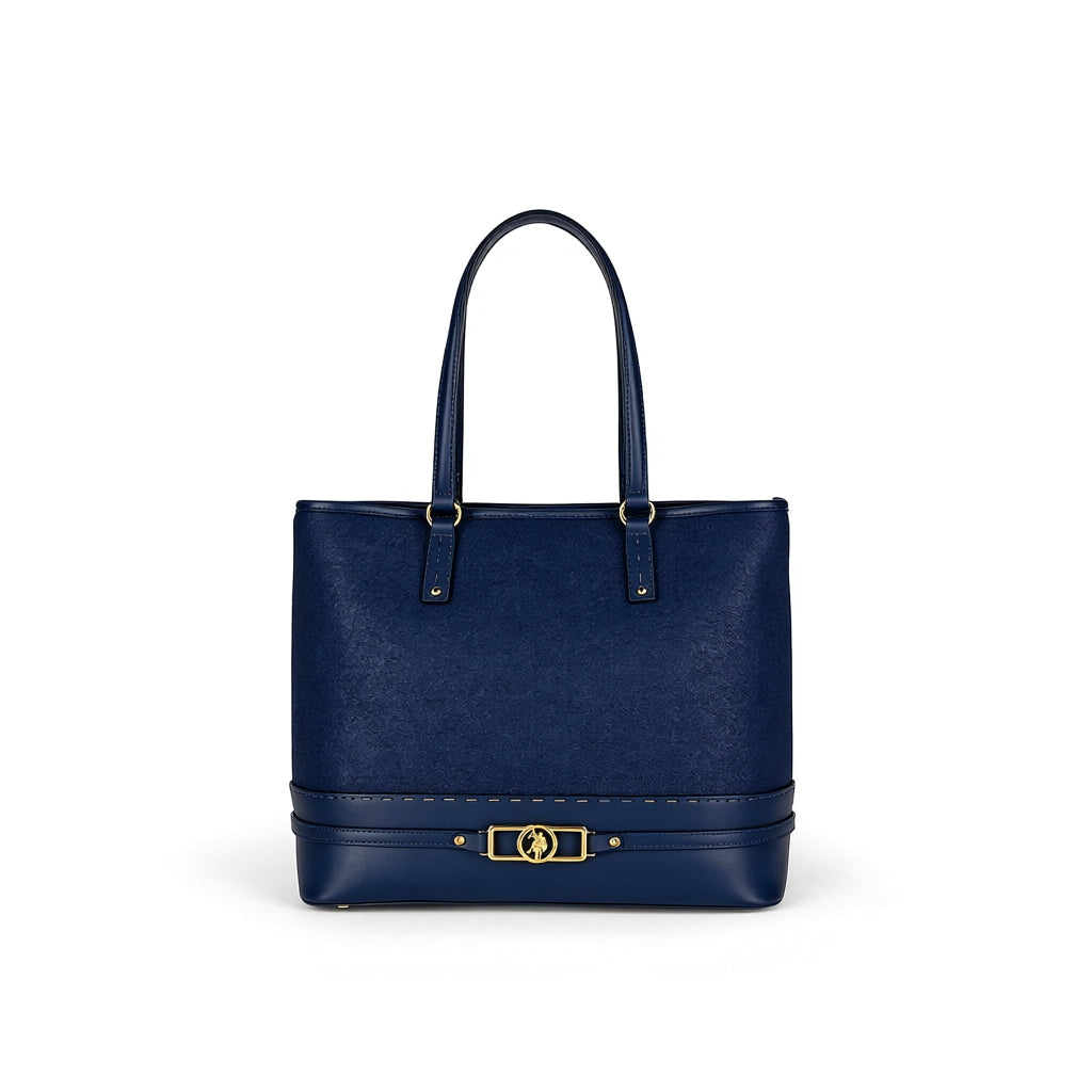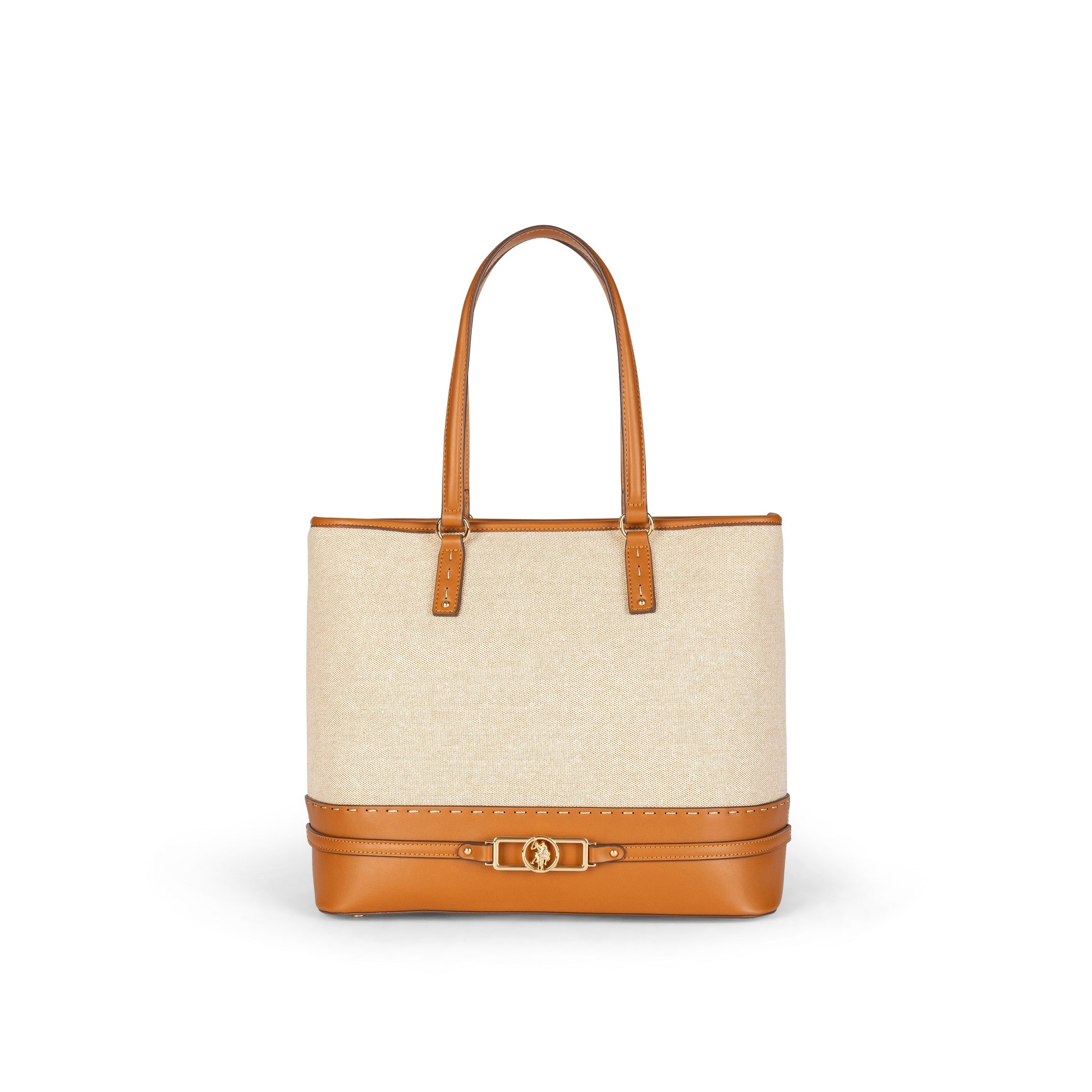 Boxy shopper in light canvas with refined PU trims and long shoulder handles. Decorative stitched belt with round USPA plaque at the lower front; reinforced base for everyday carry.