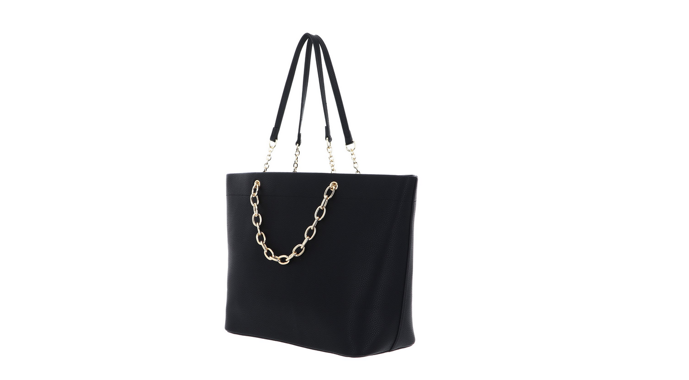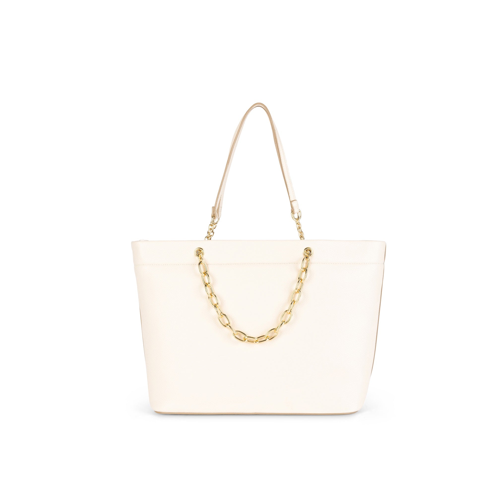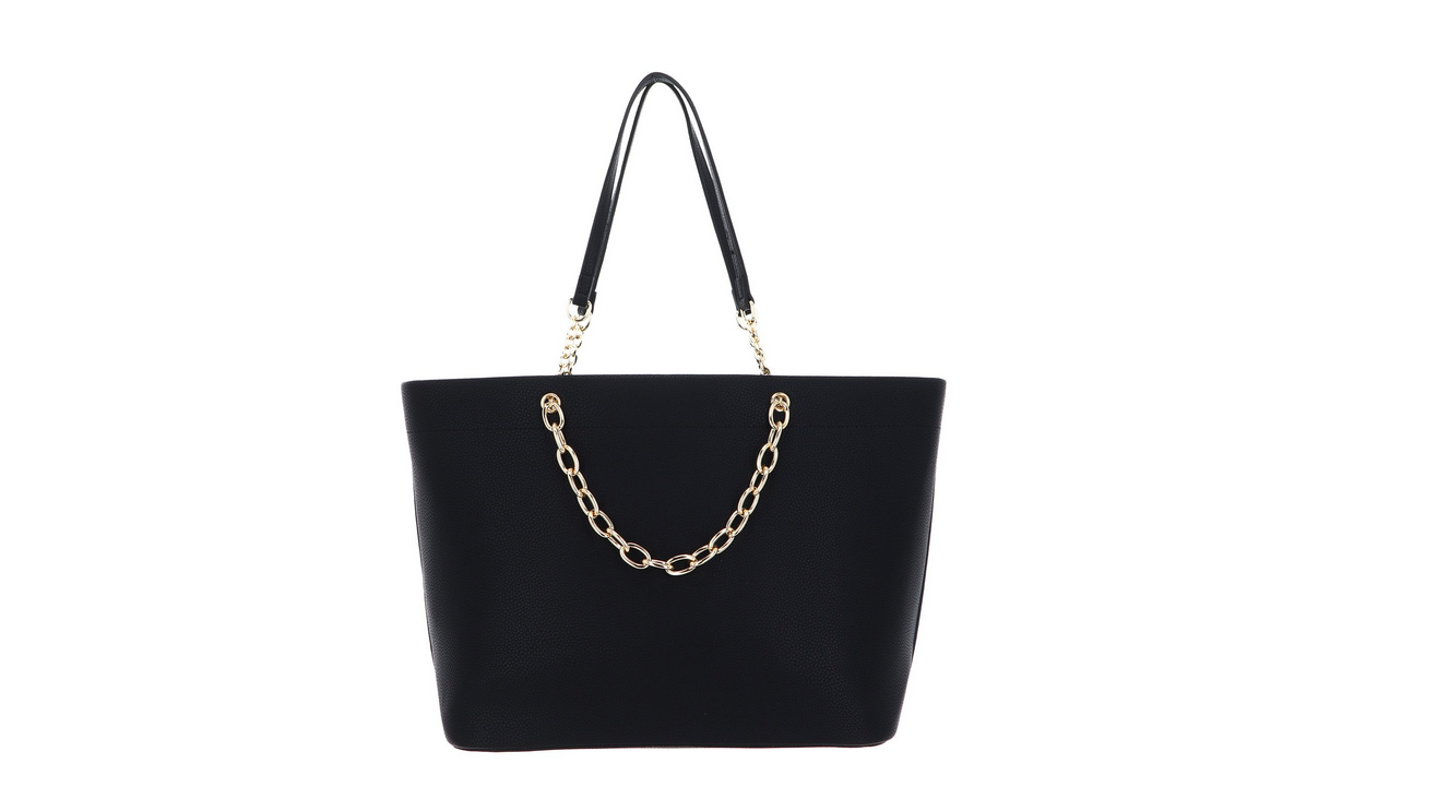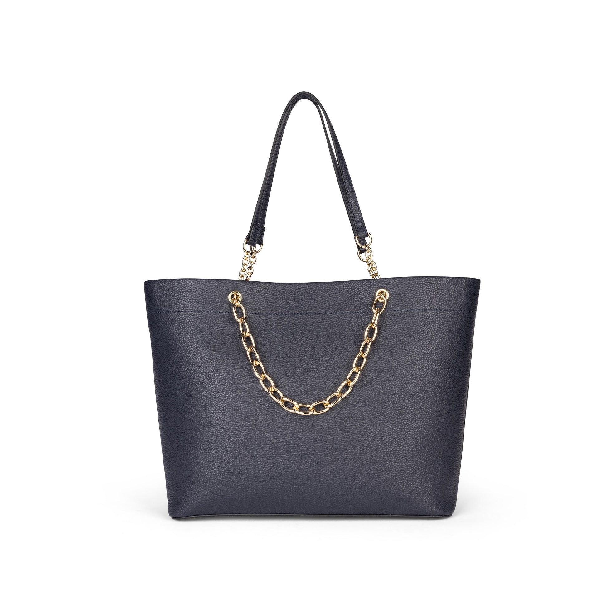 Structured shopping tote with twin chain-and-PU handles; front arched logo emblem and extra chain handle detail.