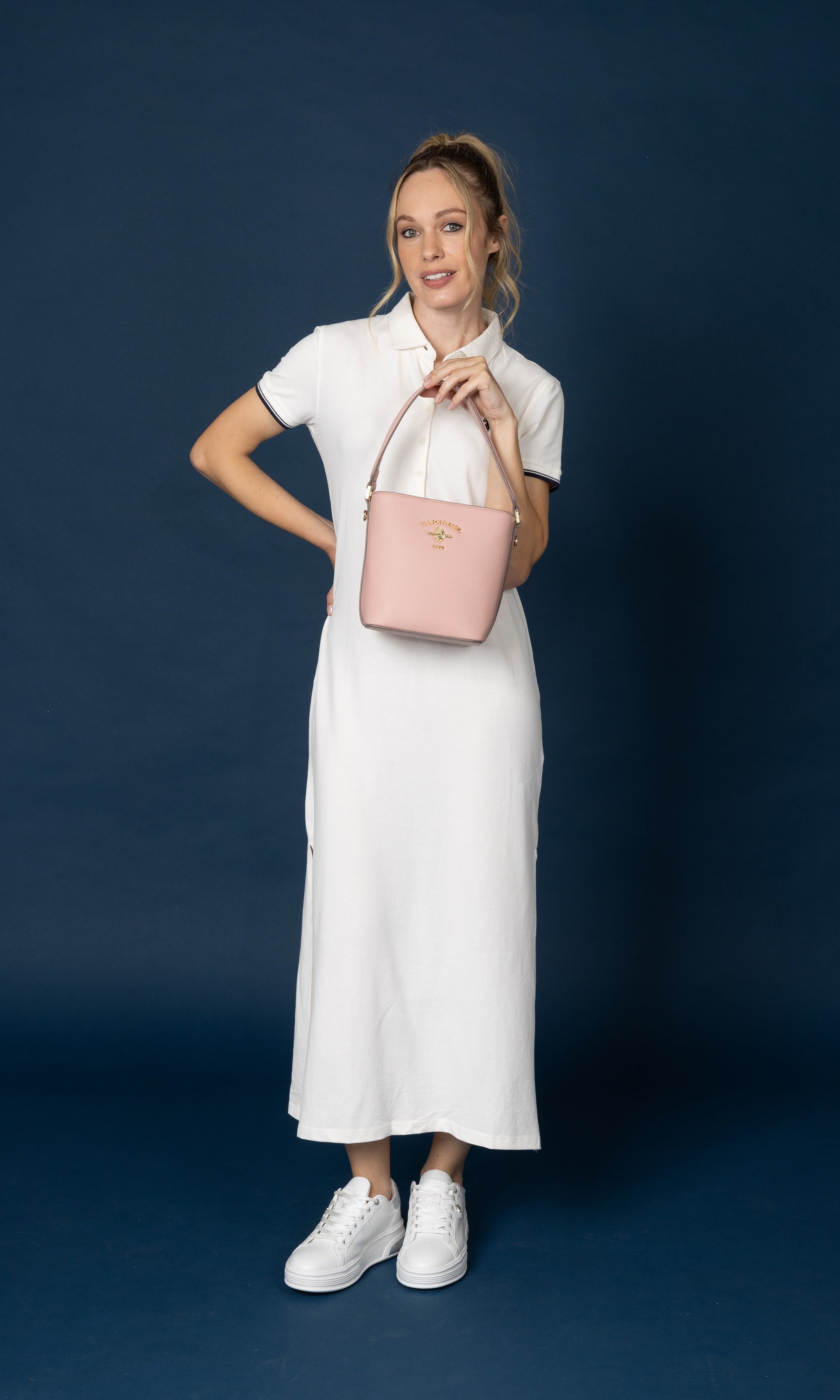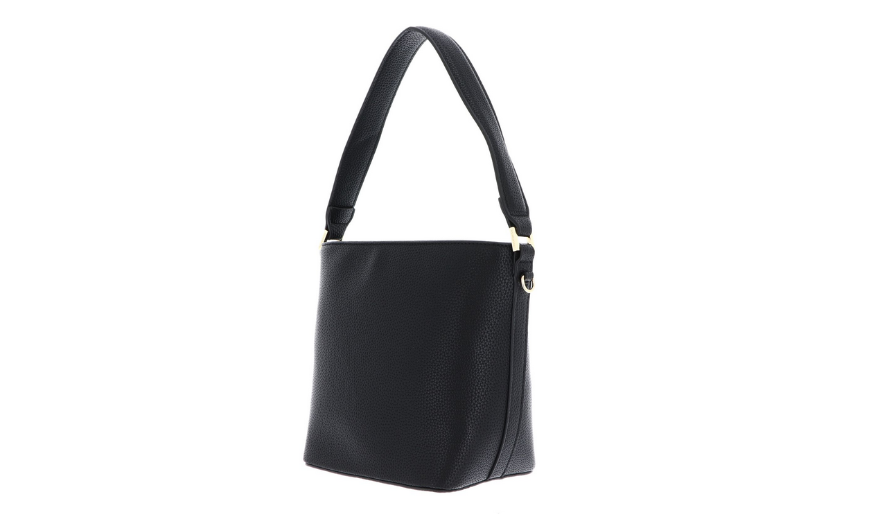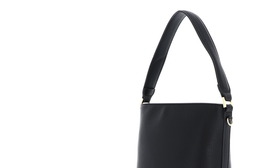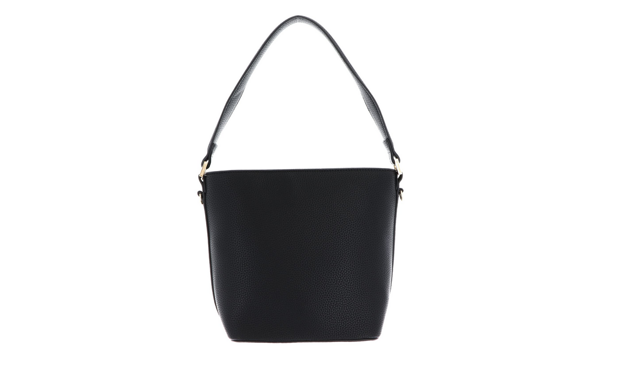 Petite bucket with top handle and zip top closure. Detachable, adjustable long