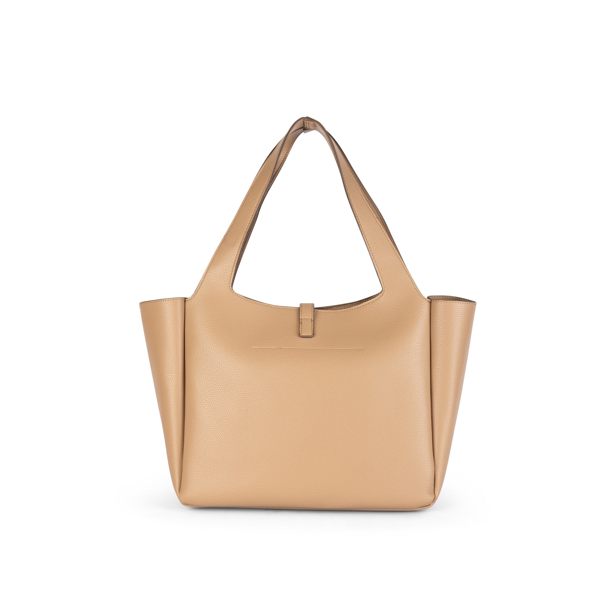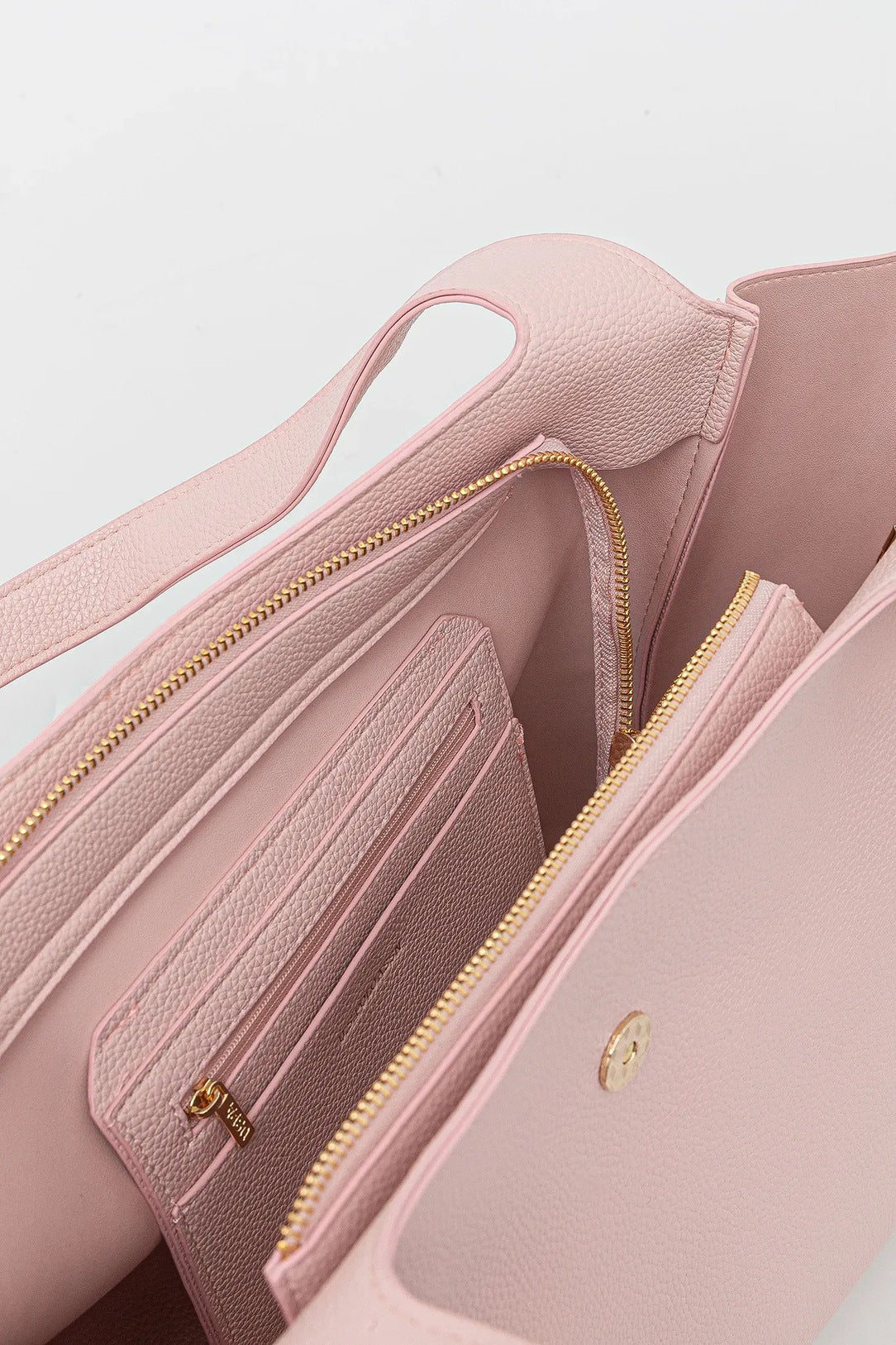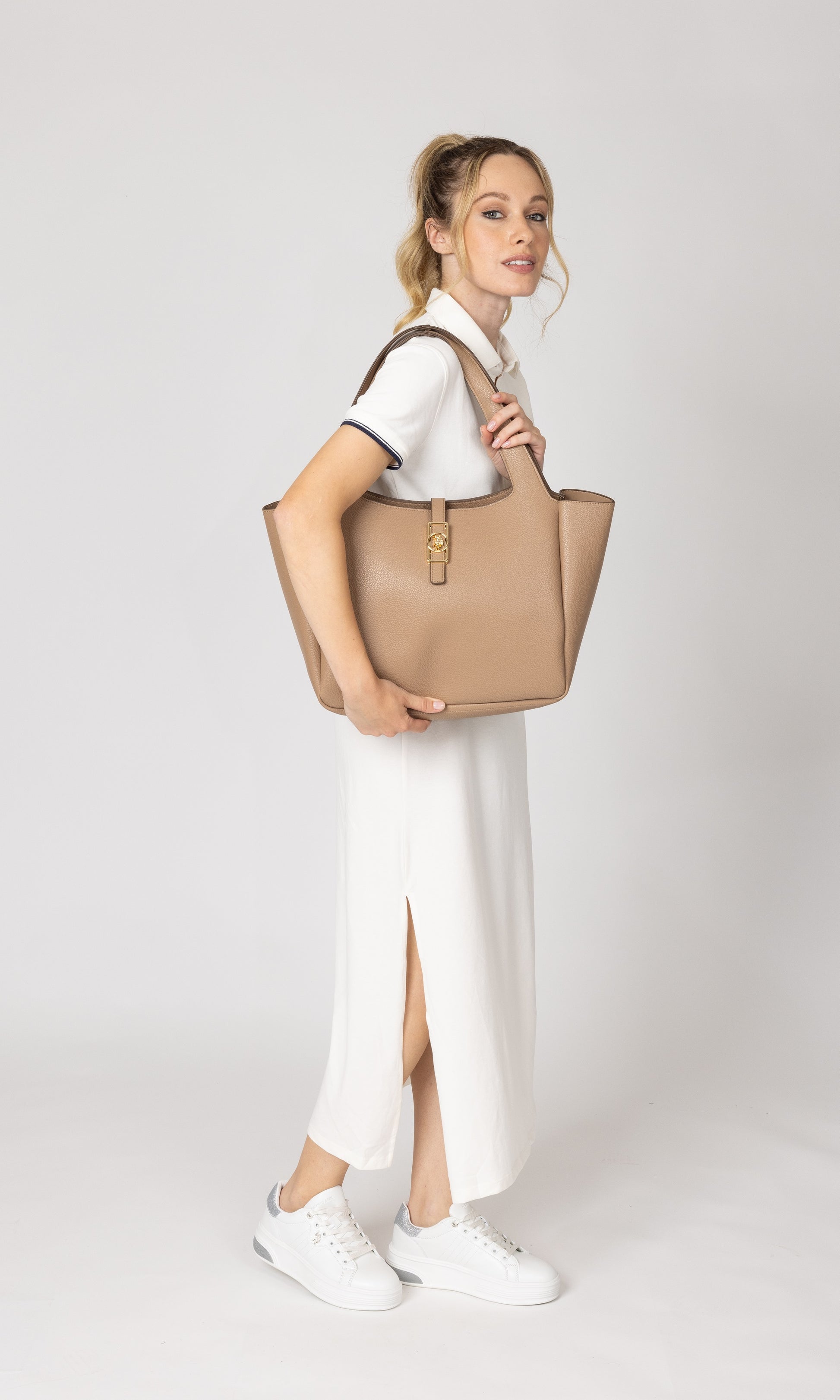 Super practical collection with a feminine touch, made in soft grain PU, highlighted by the elegant metal logoed fastener at front.