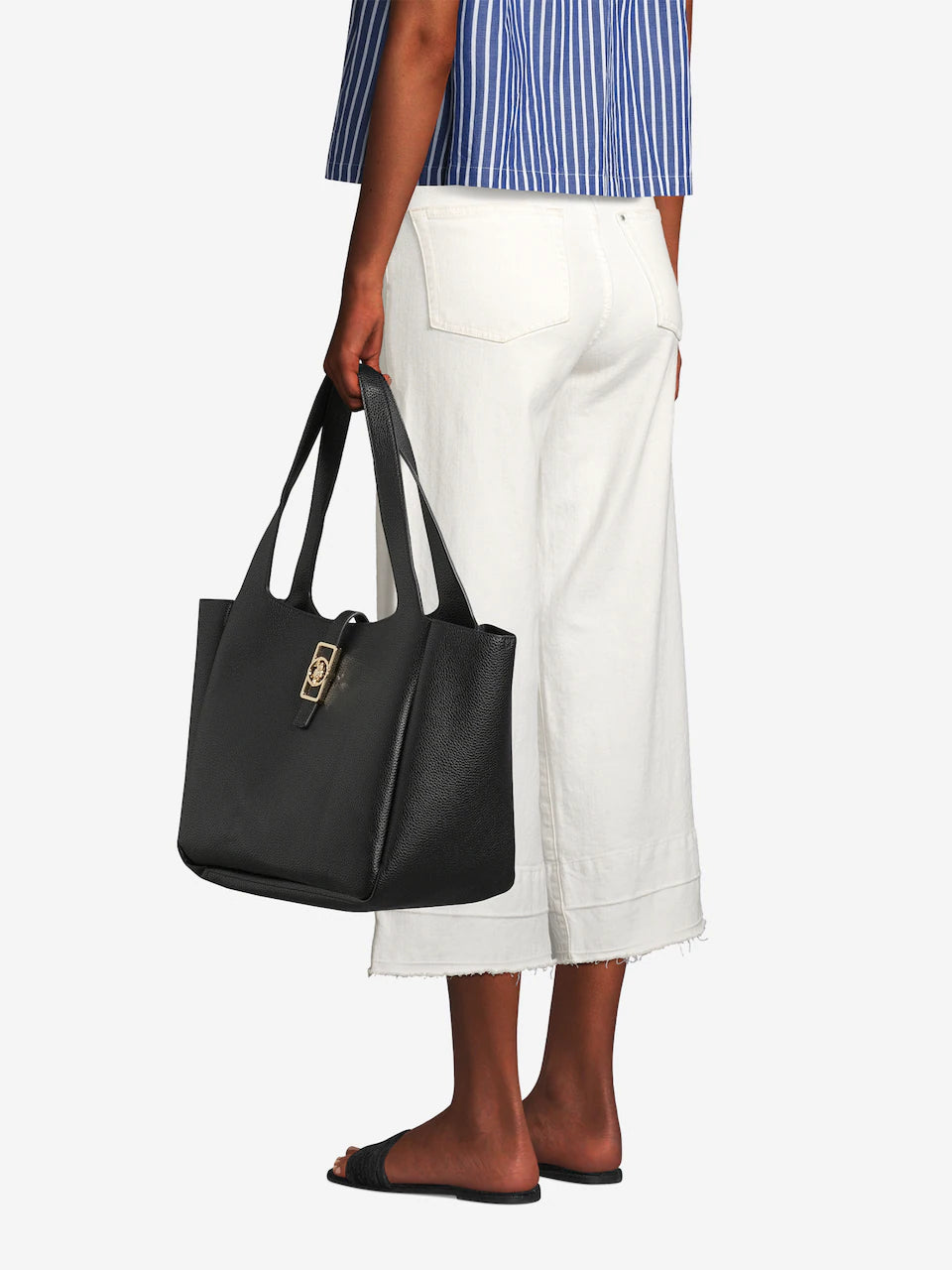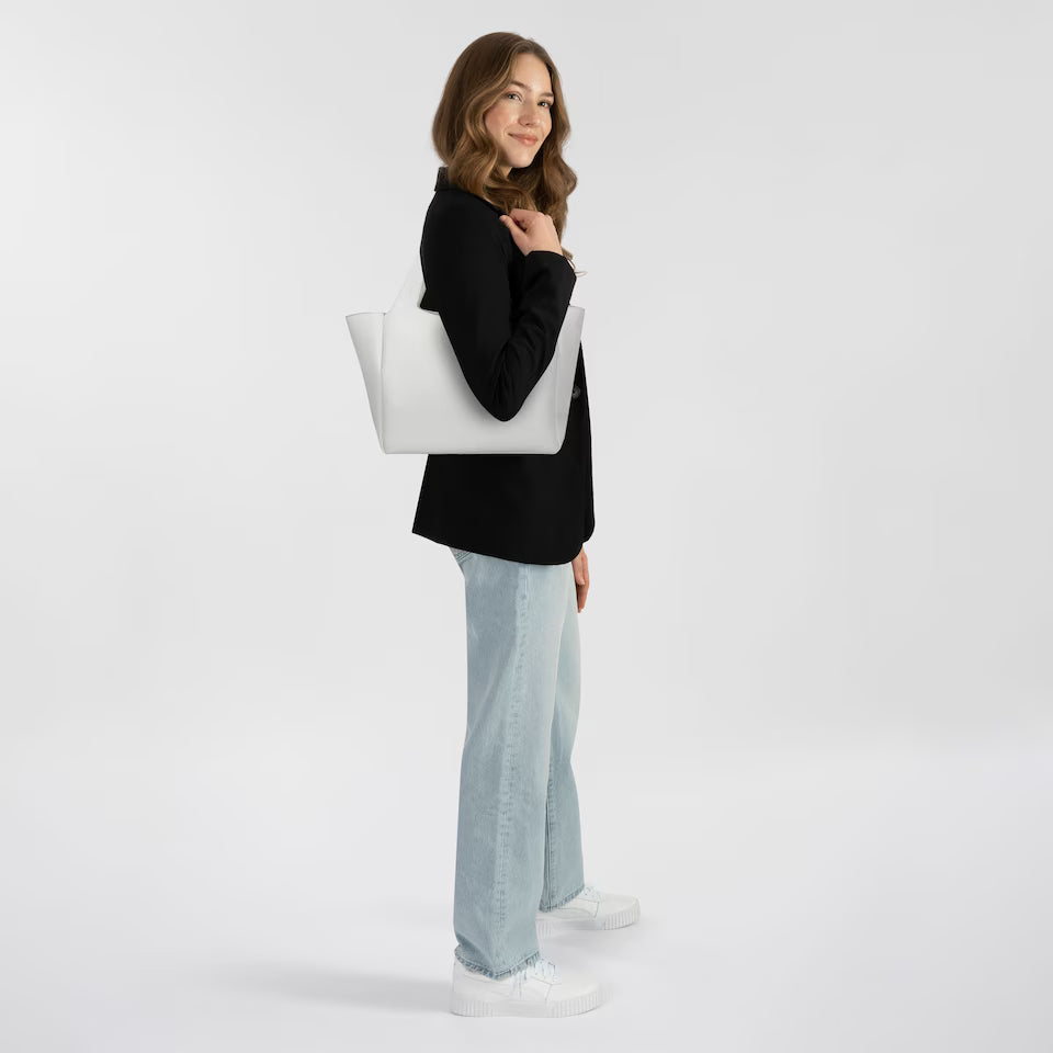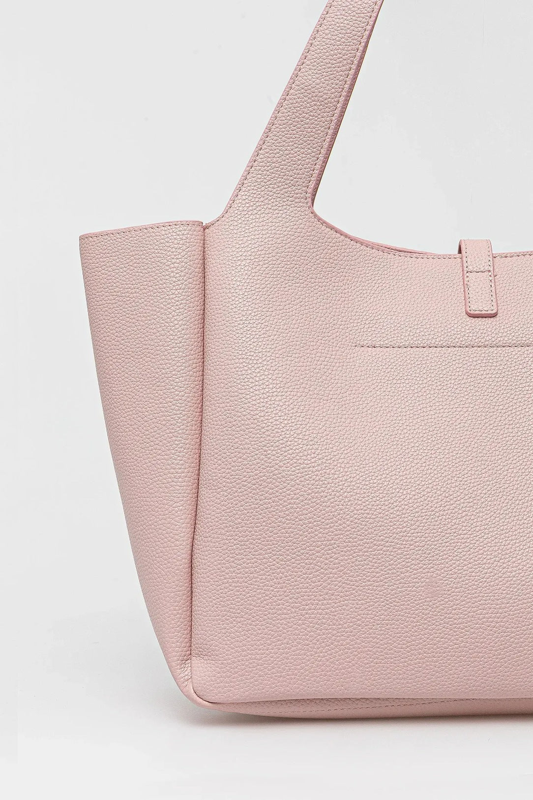 Super practical collection with a feminine touch, made in soft grain PU, highlighted by the elegant metal logoed fastener at front.
