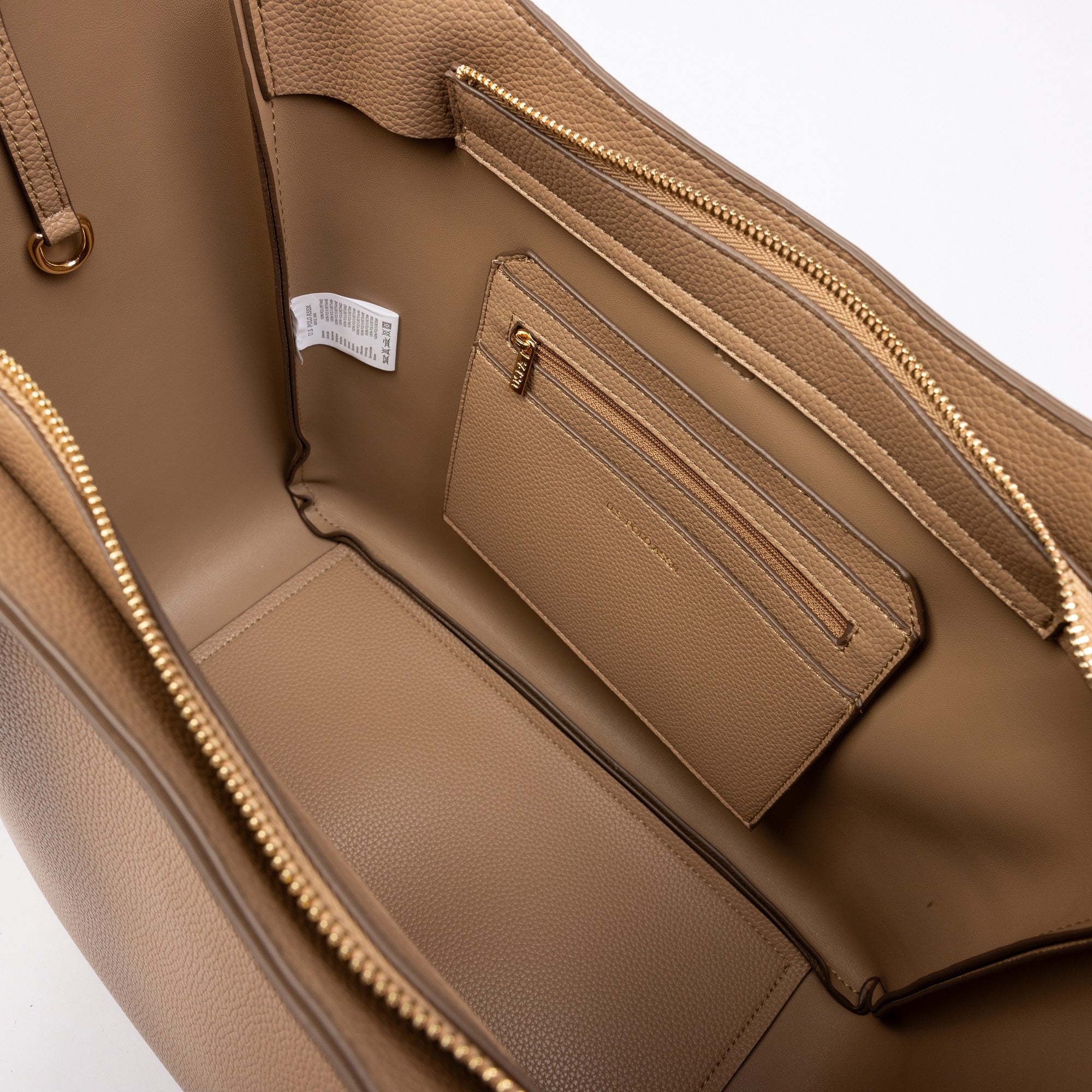 fastener tab; zipped main compartment; structured side wings for volume and side fasteners which can adjust bag into a diamond style.