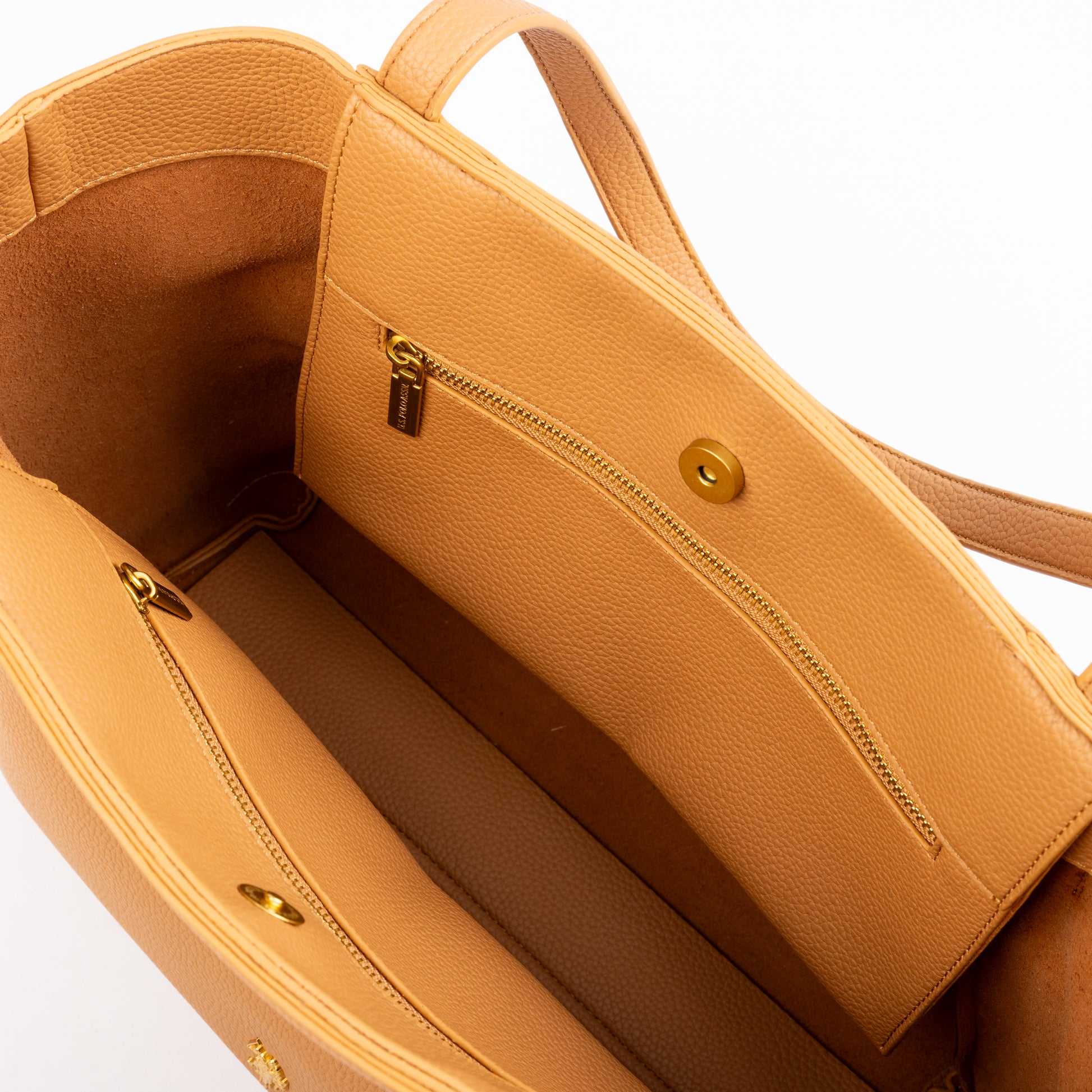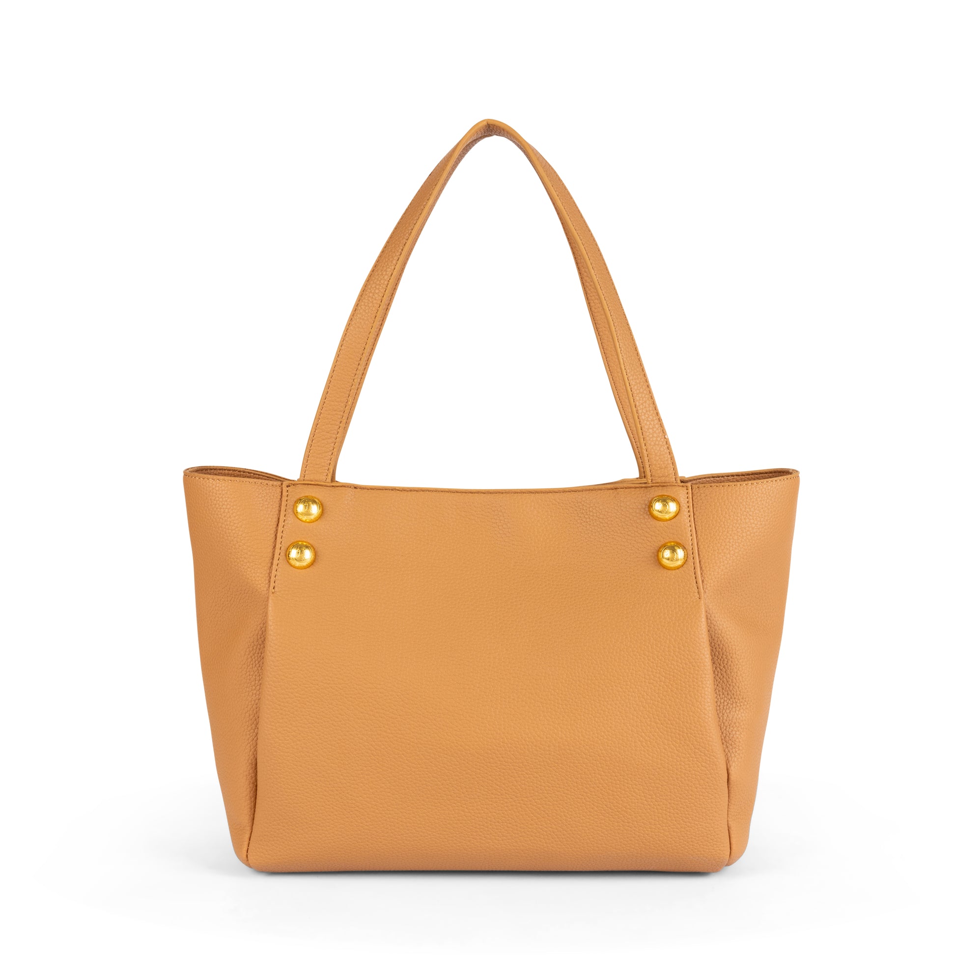 Spacious shopping tote with soft body, double shoulder handles and signature logo buttons at the upper corners. Minimal interior structure for a light, drapey feel.