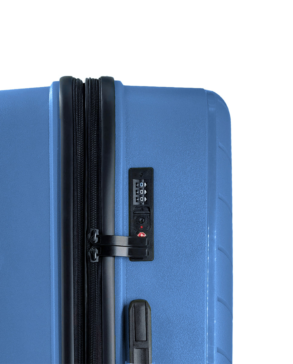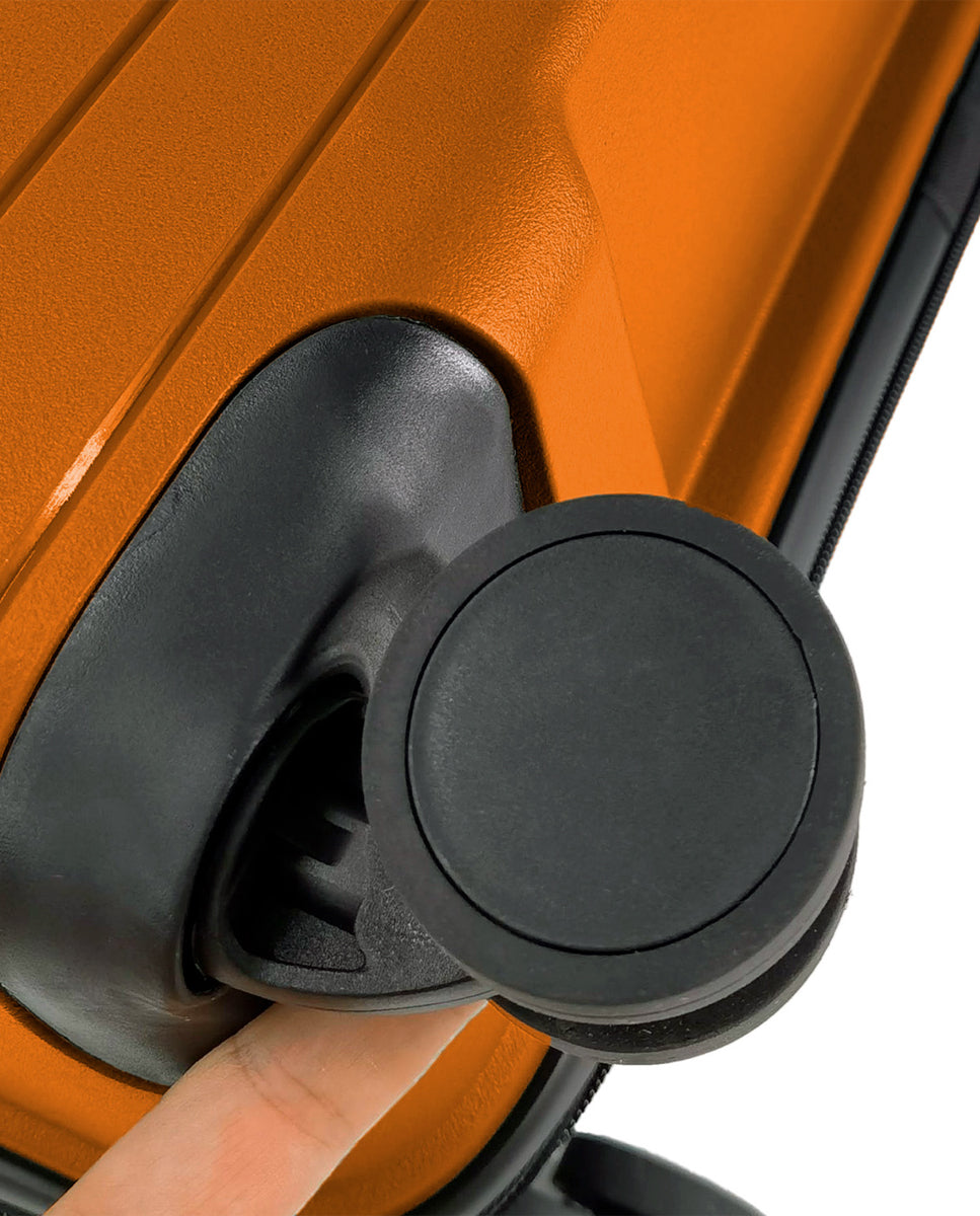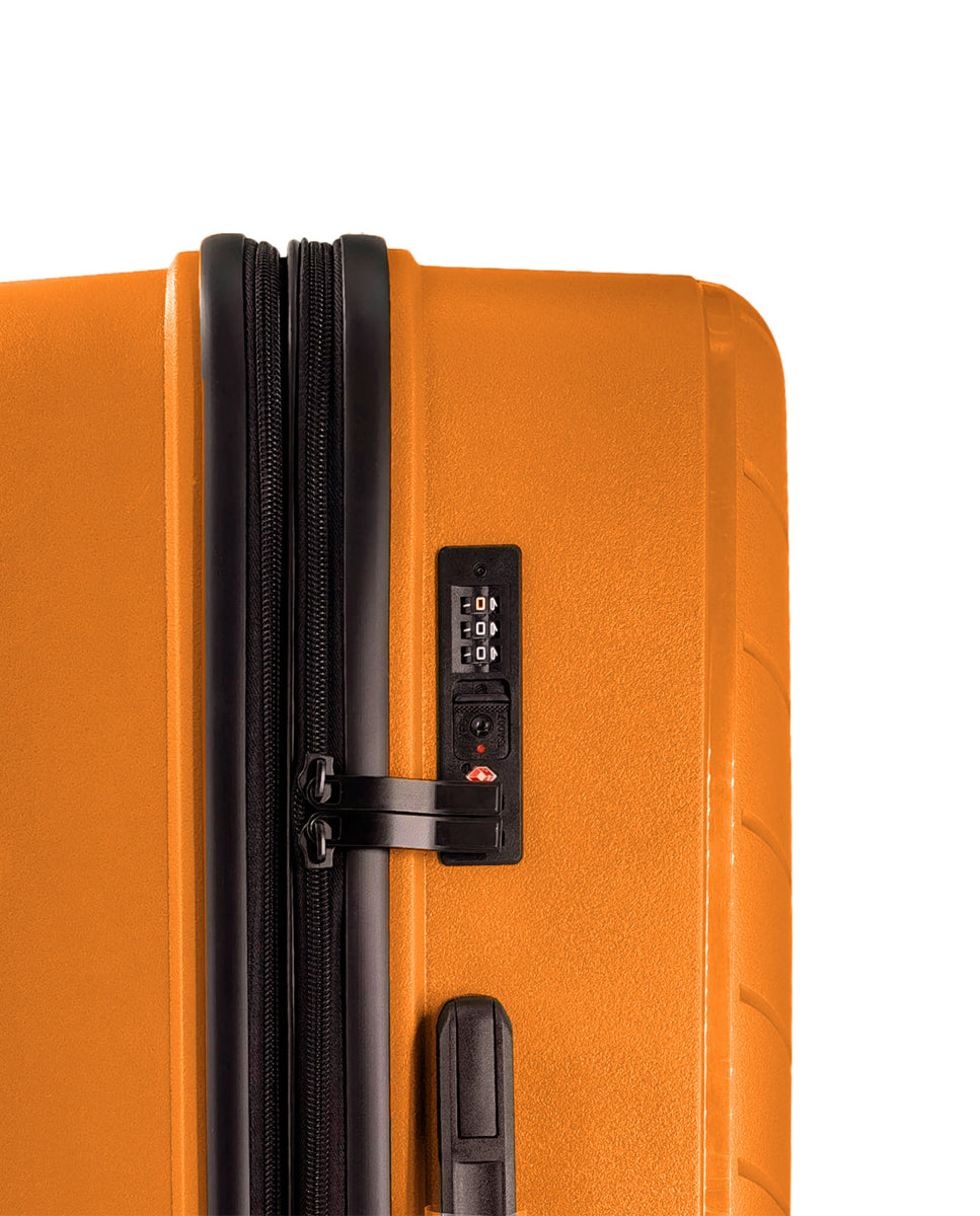 The suitcase is equipped with a built-in, flush-mounted TSA-approved combination lock that does not protrude from the body, maintaining a sleek profile. Fully rotating double wheels with a rubber coating ensure exceptionally quiet, smooth, and stable movement.