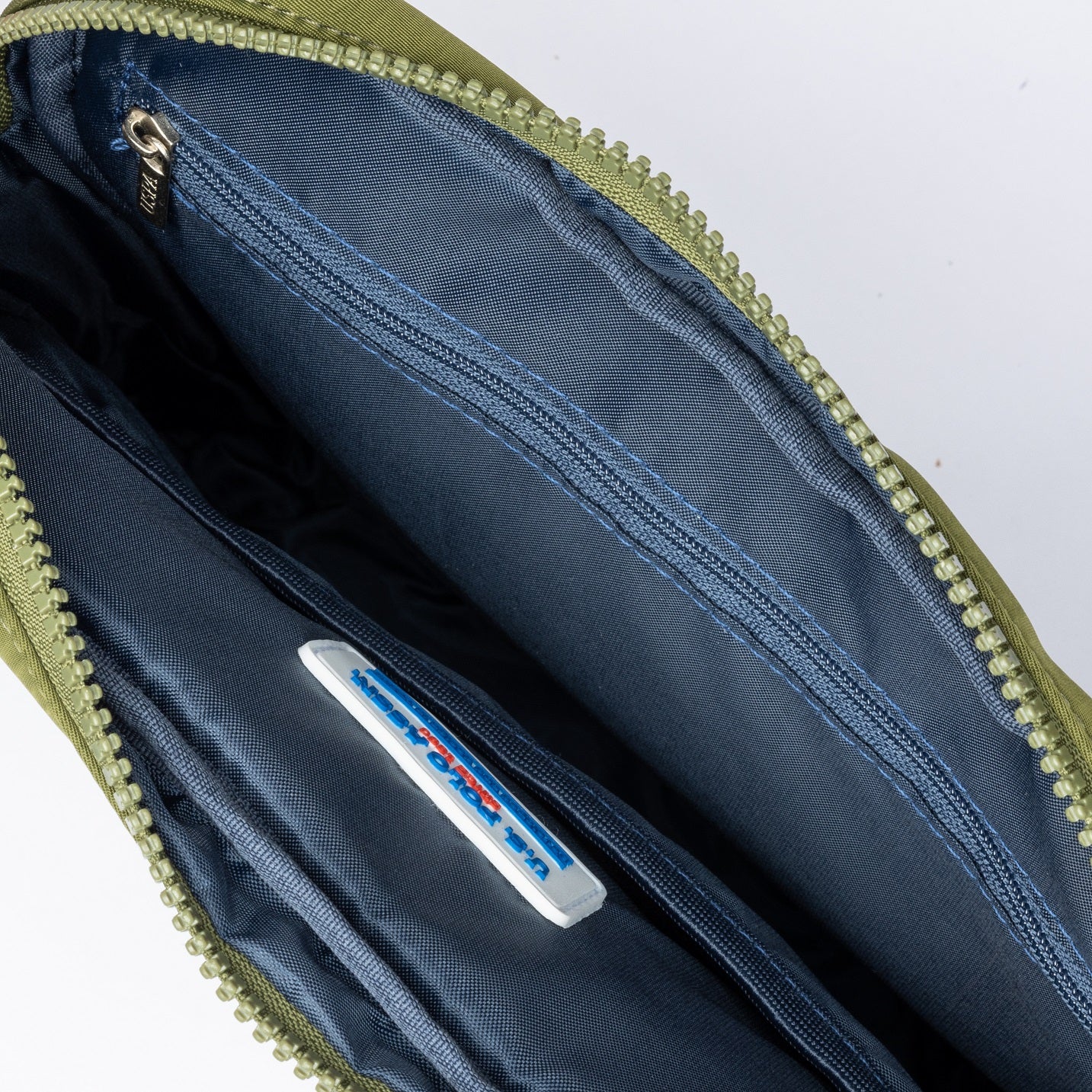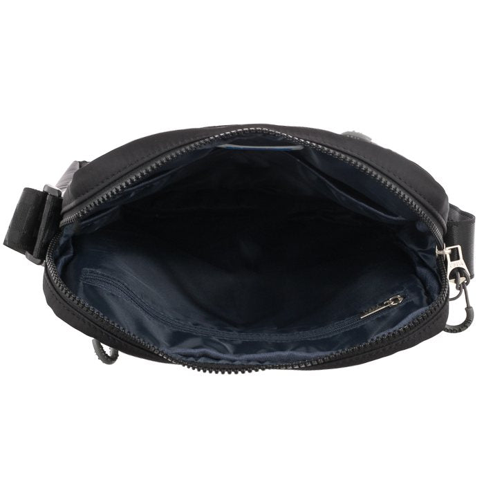 This medium crossbody offers generous capacity without bulk. Two zip‑top compartments separate items, and a large front pocket provides additional storage. Inside you’ll find slip pockets and a small zip pocket. The adjustable strap and sporty webbing make it ideal for travel or leisure.