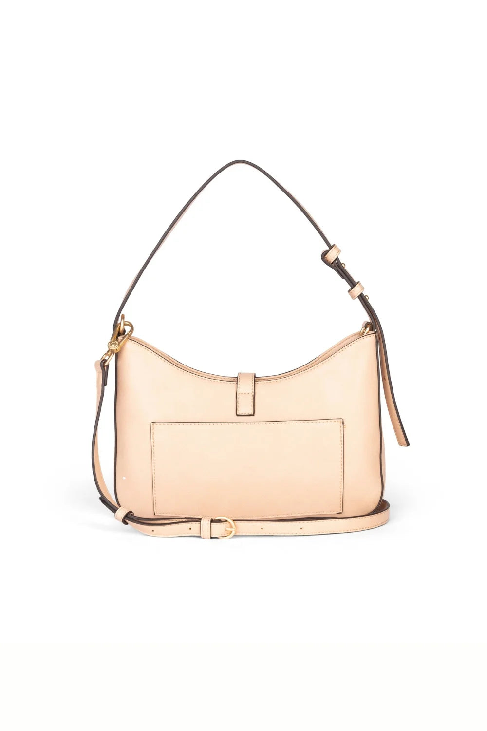 Slim mini-hobo silhouette with front strap and rich light-gold Double Horsemen clasp, giving a timeless, feminine finish.