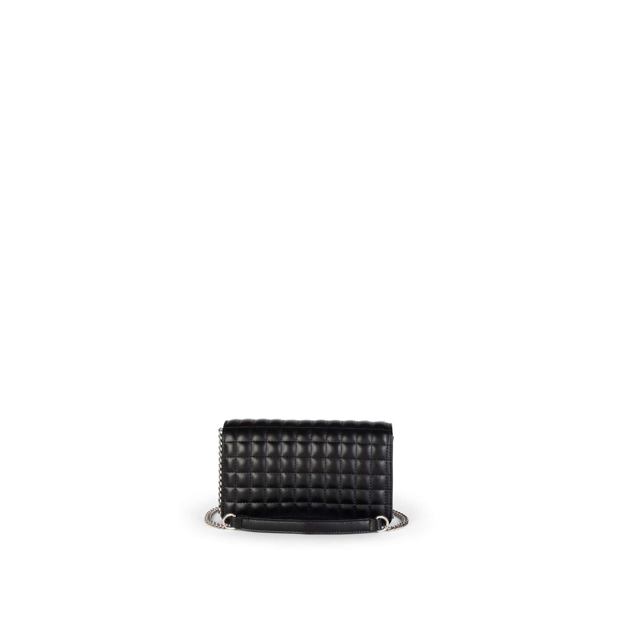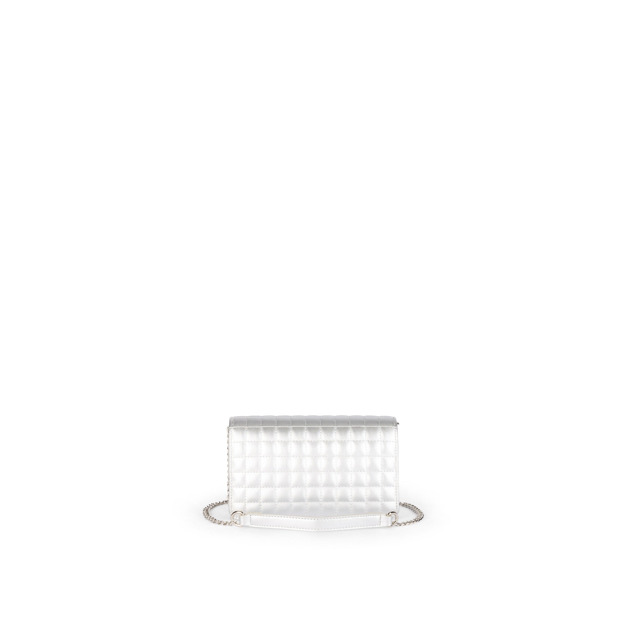 Boxy mini flap with padded quilting and long chain crossbody strap. Magnetic flap accented by a small front logo; glossy, compact and timeless.