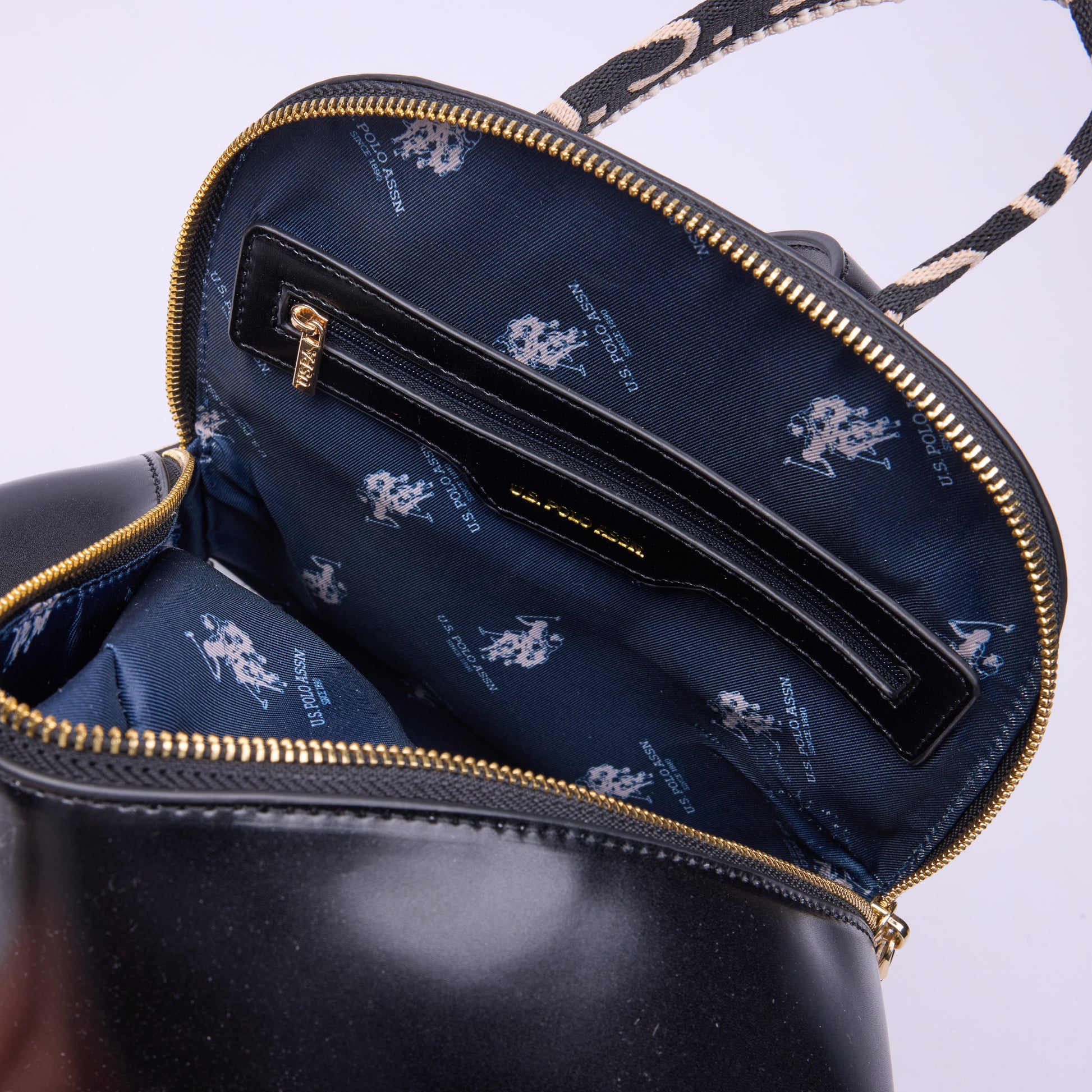 jacquard shoulder strap. Smooth-effect PU with a subtle sheen and branded metal logo.