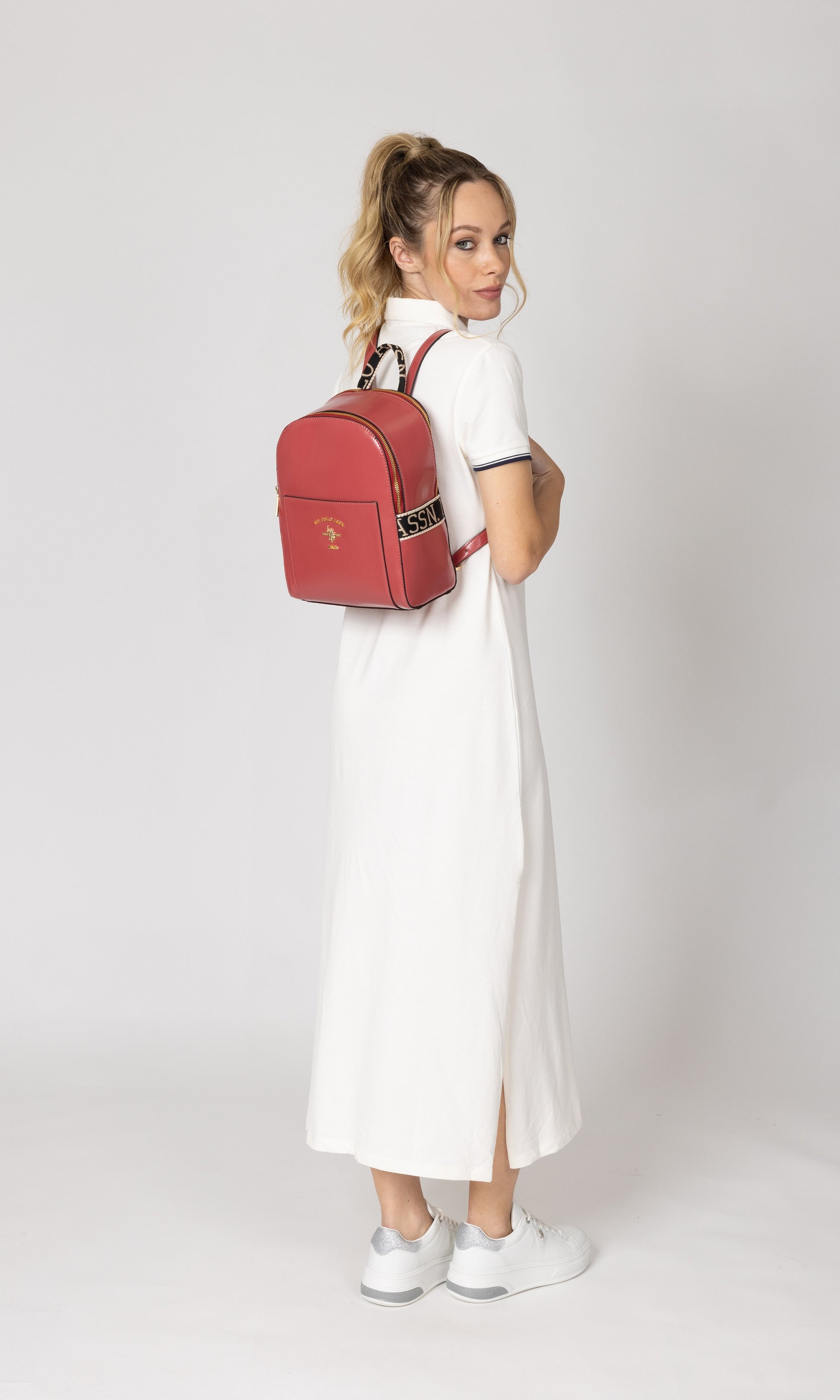 A compact rounded backpack with front slip pocket and crest logo that keeps the look neat and sporty. Large front main compartment and back slip compartment for further organization. Shown on the model, the structure sits high on the back with adjustable shoulder straps for a close, comfortable fit.