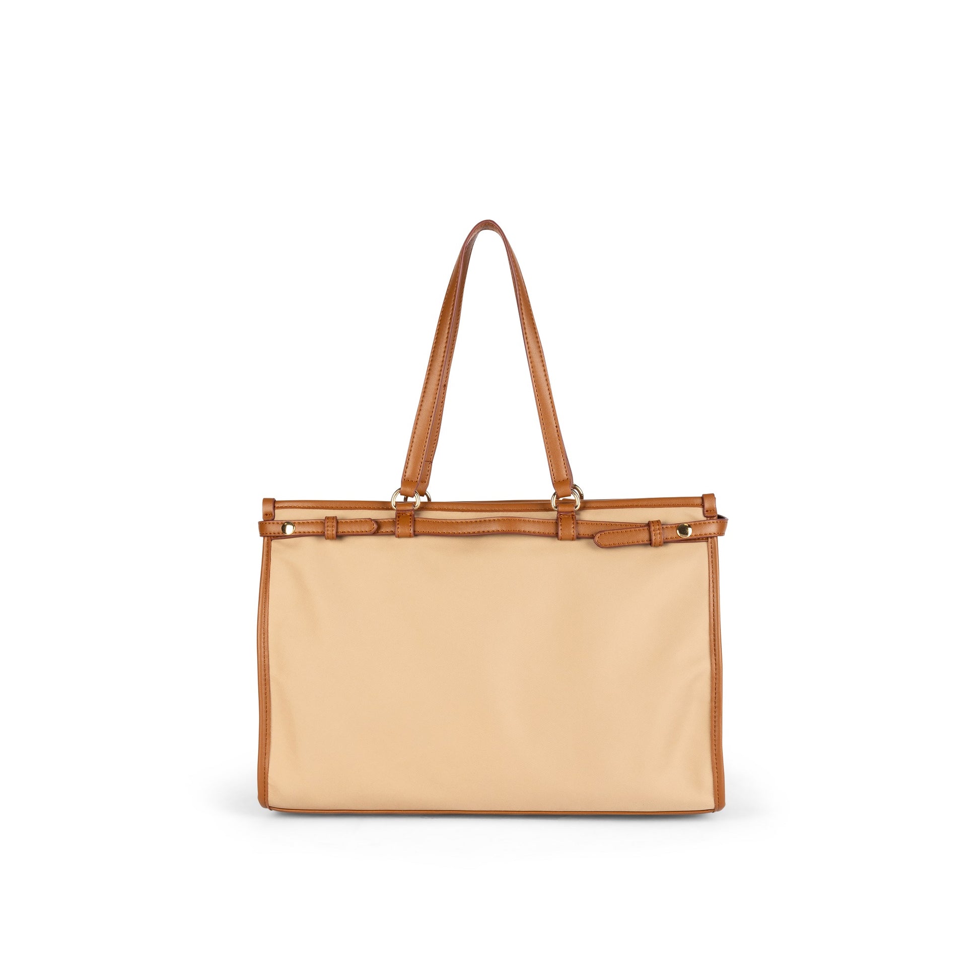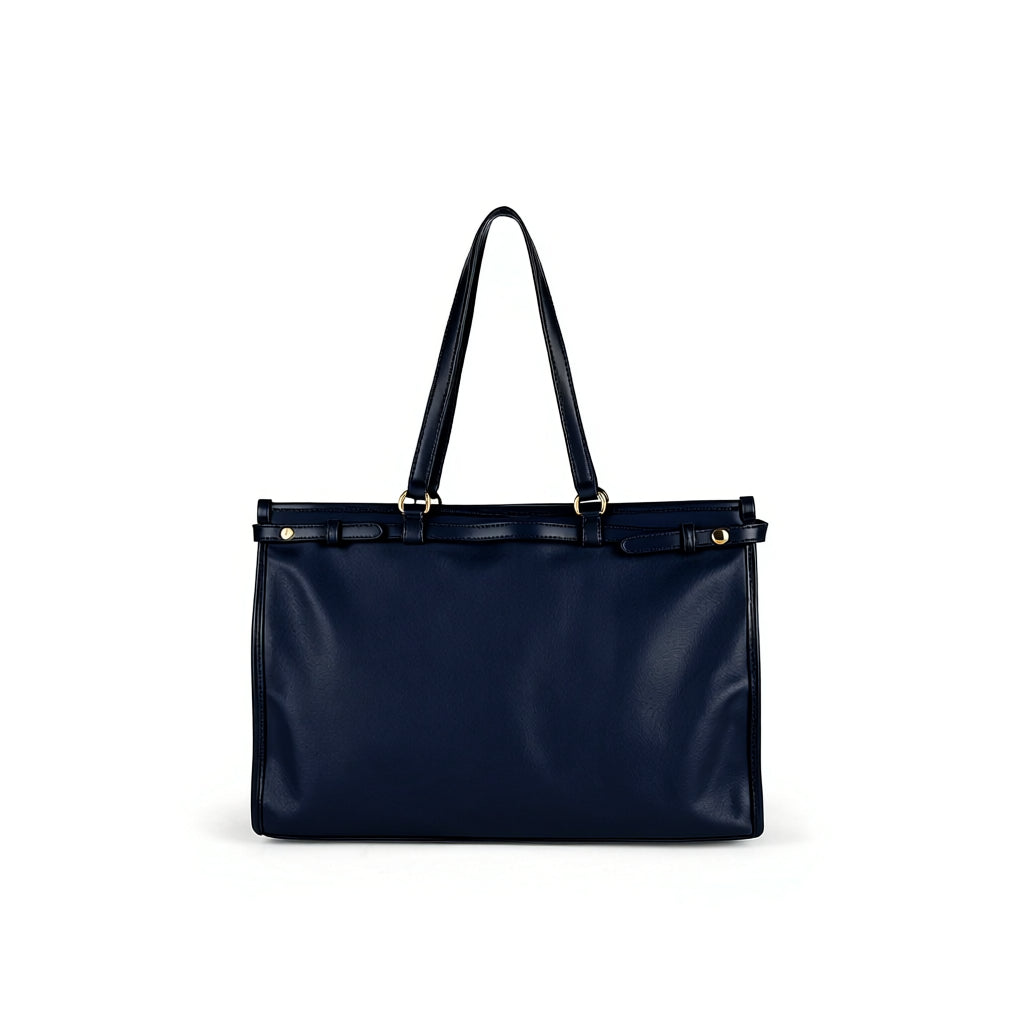 Sleek rectangular tote with framed top trim and buckle details; slim shoulder handles and zip closure.