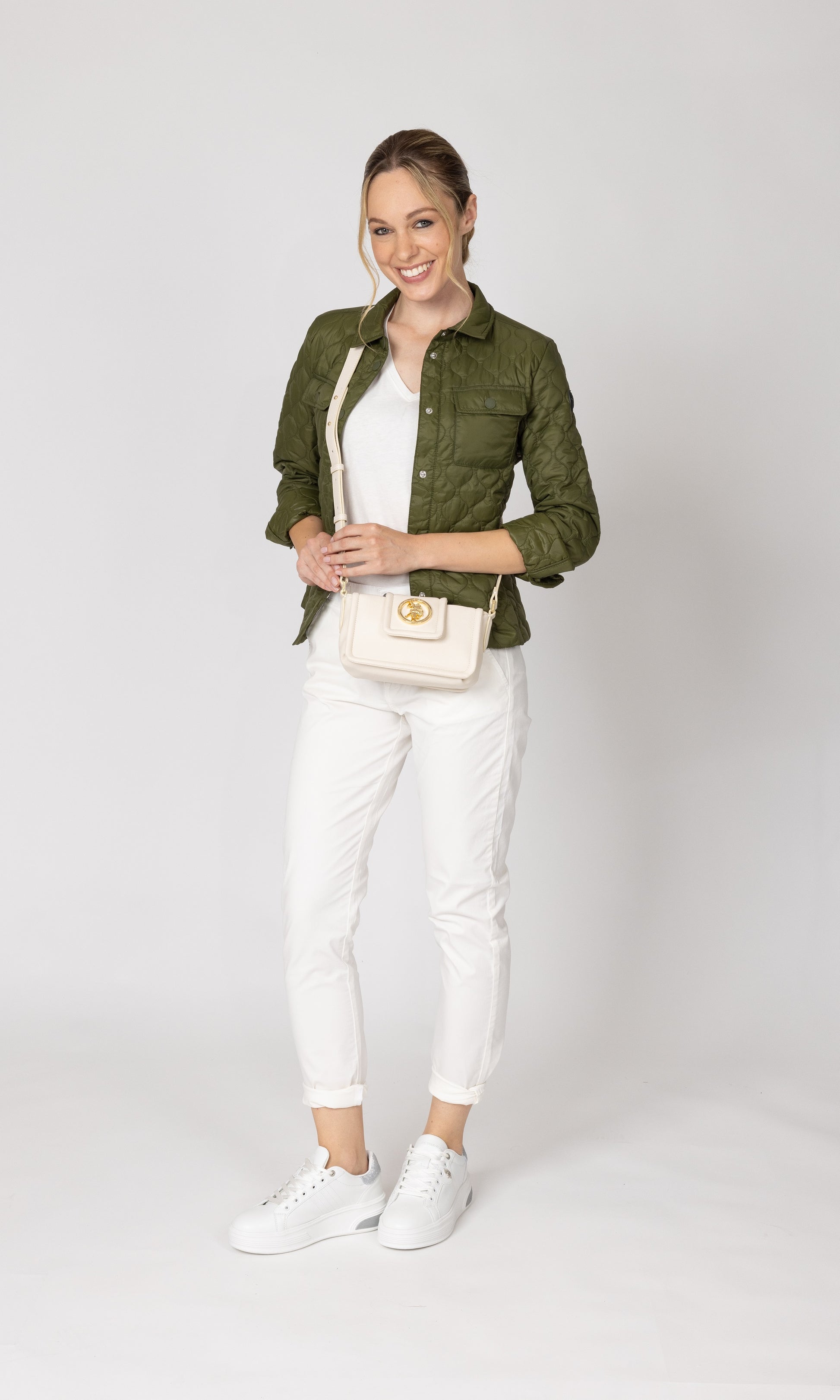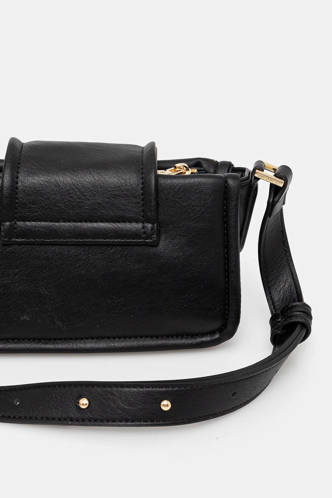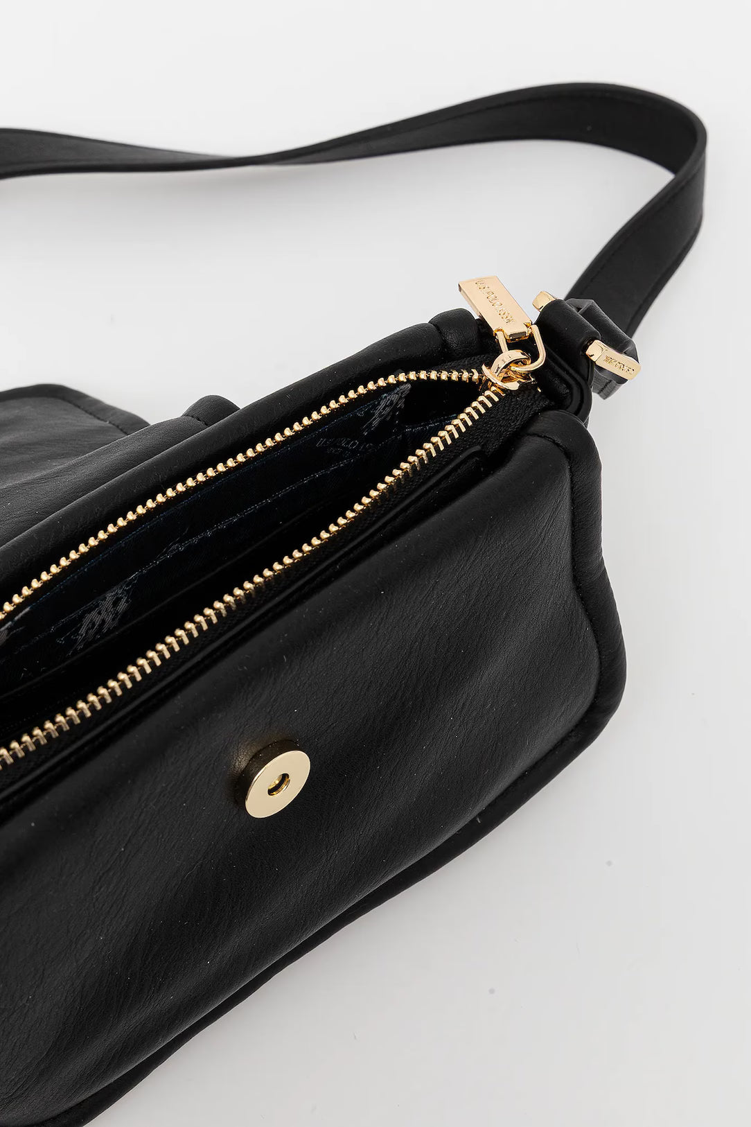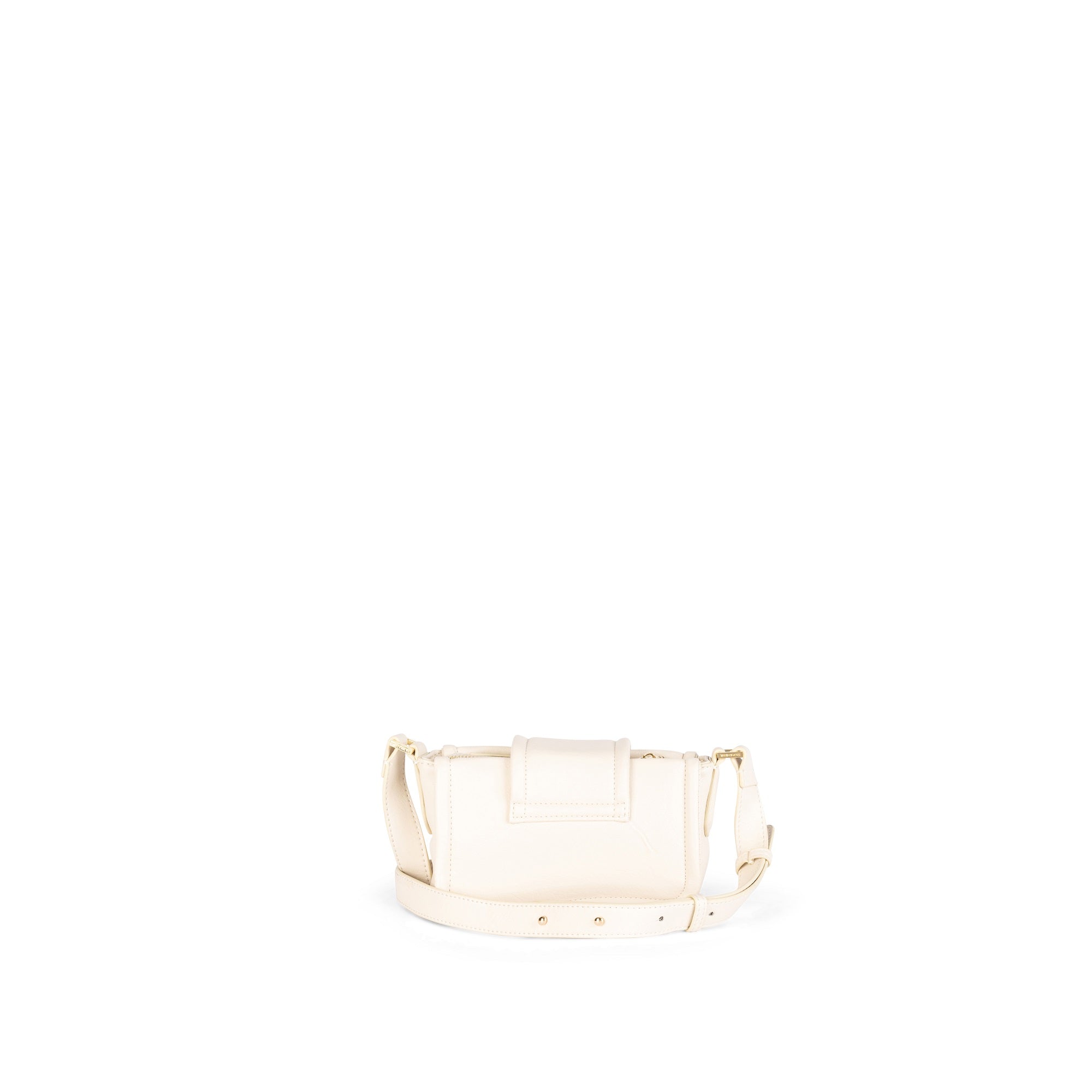 Structured crossbody with a front magnetic flap, central medallion plaque and main zip closure.